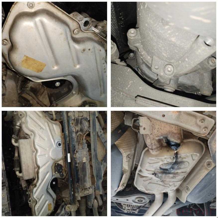 在商家的协助下,借用了一下旁边修理厂的举升机,车辆举升后拆掉发动机下护板,可以看见发动机下面还是挺干爽的,没有渗油痕迹;零部件固定螺丝也没有存在拆卸,变速箱后端部位固定螺丝、变速箱脚垫也都没有动过,综合来看可以确定发动机、变速箱没有落地大修;但是,排气管中段有比较严重的剐蹭变形。