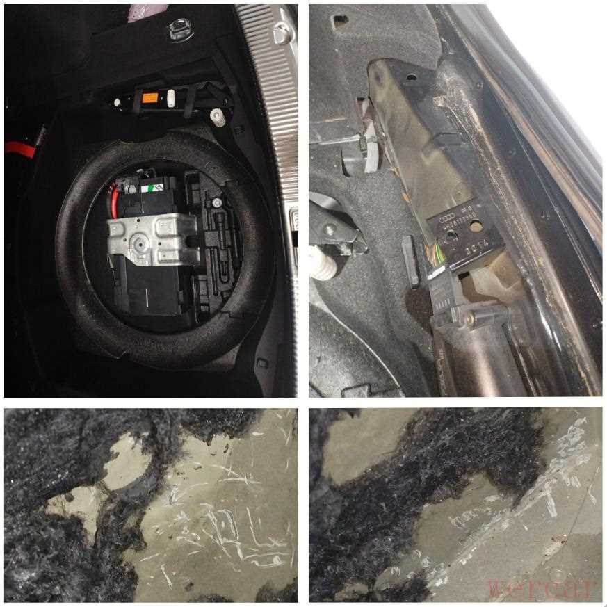 拿掉行李舱饰板后,发现这车居然没有备胎!我在想,会不会是商家整备车辆的时候拿下来忘记装上去!后围板内侧胶条饰板拔掉后,可以看见后围板内侧没有变形褶皱,但是在拔掉右侧叶子板内侧饰板后看到了明显的钣金修复痕迹,原车内侧的隔音棉也破坏了。好在没有烧焊很急,在这一点上,维修的师傅还是不错的,没有上整形机烧焊,而是一点点敲打修复。