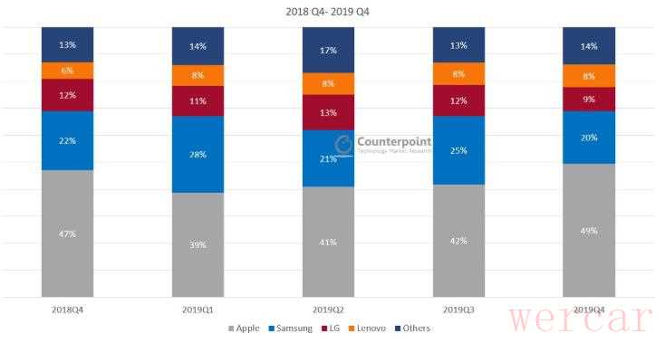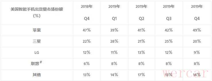 Counterpoint发布的报告显示,从2018年Q4到2019年Q4,美国市场智能手机出货量的主要市场份额均被苹果、三星、LG、联想四大厂商牢牢占据。