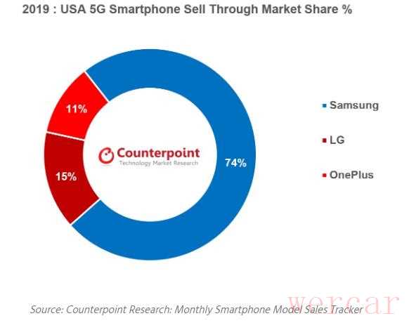 在5G手机方面,2019年的美国市场被三大手机厂商占据,其中三星占据了74%的销售份额,LG占据15%,另一位则是中国手机厂商一加,占据11%的份额。也就是说,早已有中国手机厂商在美国5G手机市场拔得头筹。