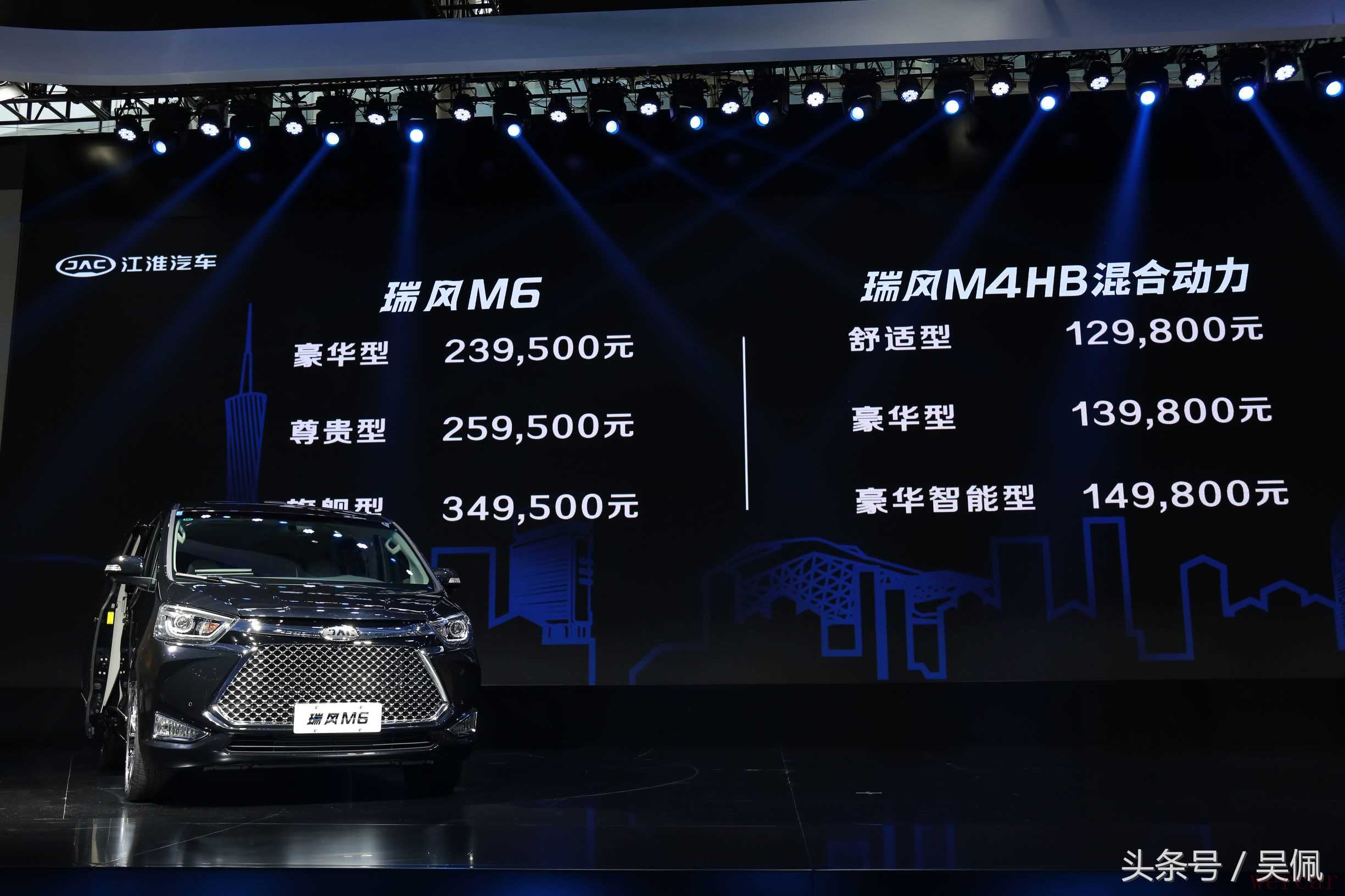 11月17日,江淮在广州车展上正式推出全新高端MPV车型——M6,其售价为23.95-34.95万元。同时国内首款混合动力MPV江淮M4HB混合动力车型也正式上市,售价为12.98-14.98万元。