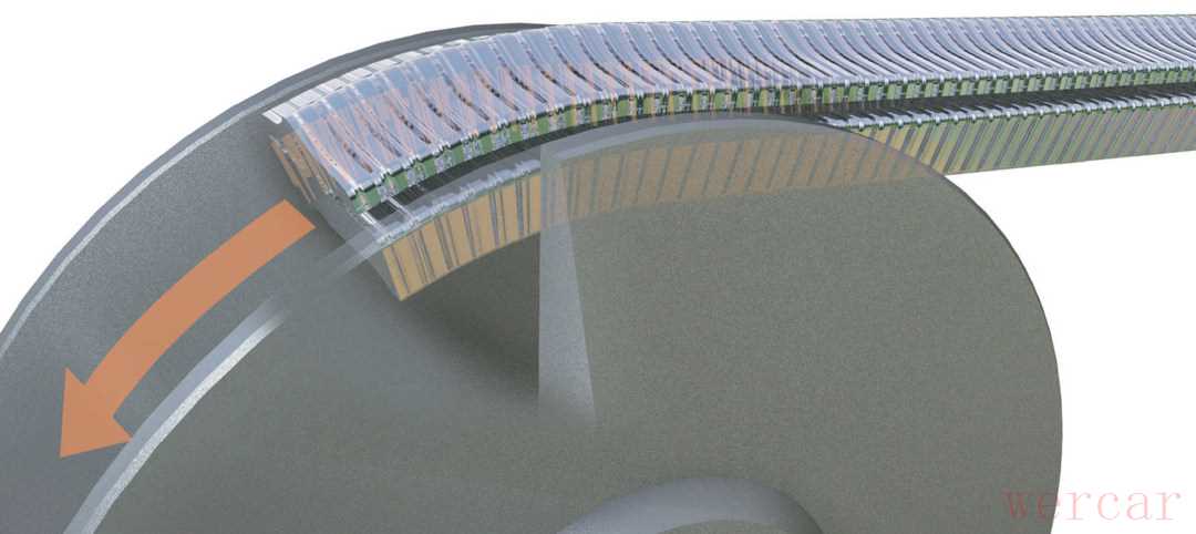 它的传动带主要由两部分组成:钢带和锥形钢片,钢带将锥形钢片串联在一起,形成一条完整的传动带。锥形钢片和锥盘直接接触,通过摩擦力进行传动。