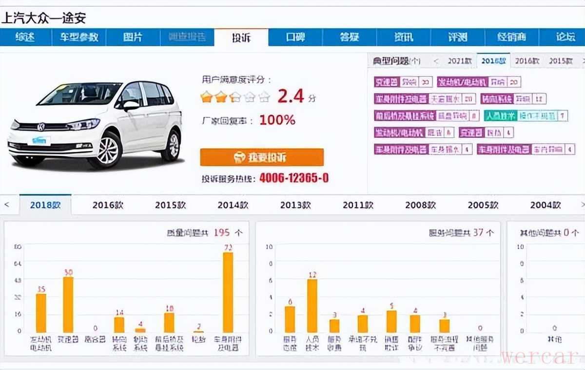 除产品力外相信大众途安的潜在消费还比较关心起其质量口碑问题,接下来也聊聊大众途安车主的真实口碑。参考第三方网站车质网,为保证相关数据及信息具有普遍意义,我们选择2018款途安进行讨论。2018款途安共收到质量投诉问题195个,主要分布在变速器异响30例、发动机/发电机异响20例、天窗漏水20例以及转向系统异响12例等等。总体上质量口碑不算突出,但不至于说是存在严重质量缺陷。