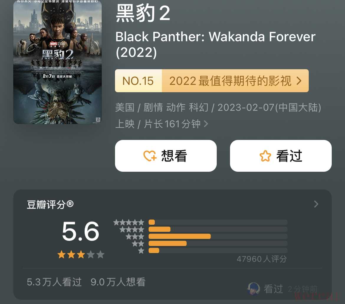 另一边,《黑豹2》内地口碑也受挫,豆瓣评分一天内从5.7跌至5.6,5.3万人参与打分,不敌上一部的6.5分,在漫威电影中排名倒数第二。目前,漫威豆瓣口碑最高的作品为《复仇者联盟4:终局之战》(8.5分)。