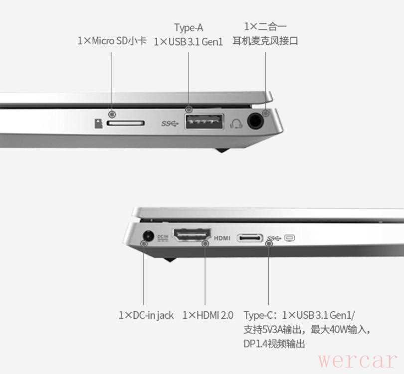 接口上比较少,有一个USB,一个Type-C,电源接口,小卡插槽,还有HDMI 2.0。支持WiFi 6,蓝牙5.0,具有53.2Wh电池,重量1.39kg。系统为Windows 10,不带Office。