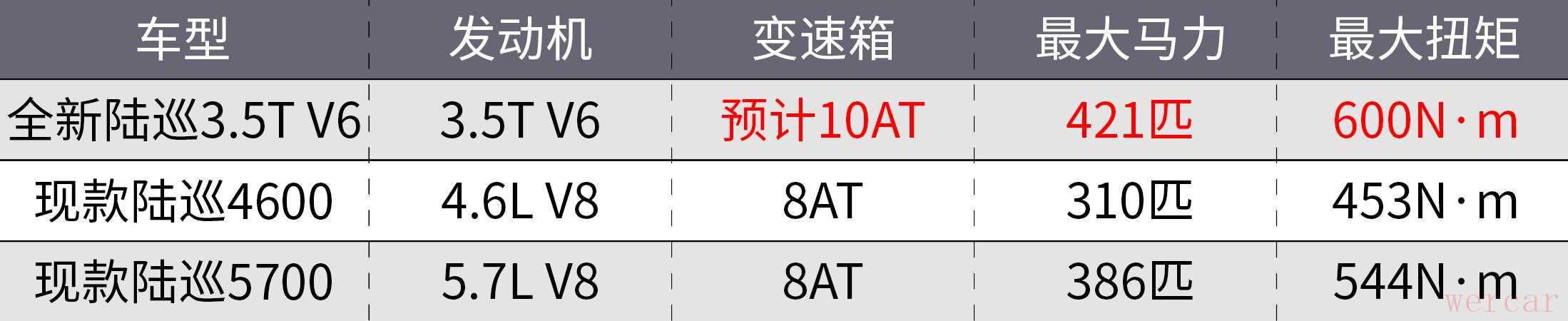 这台3.5T发动机的诞生,就是为了取代原本的4.6L V8以及5.7L V8自然吸气发动机。从参数对比来看,新的3.5T V6发动机,已经全面超越了现款陆巡上的4.6L V8以及5.7L V8发动机。至于对越野场景不利的涡轮增压发动机的迟滞问题,对于排量达到3.5L、且拥有两颗低惯量涡轮增压器的V35A来说完全不需要担心,它从1600转开始就能输出600N·m的最大扭矩,比现款5.7L V8发动机的峰值扭矩提前了1600转!除了声浪或许不会像老款V8发动机那么雄壮外,这台3.5T发动机相比老款几乎没有任何短板。