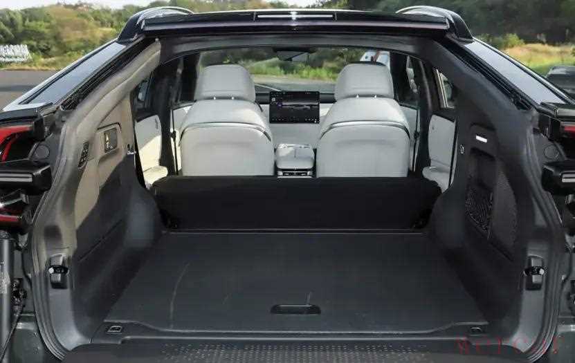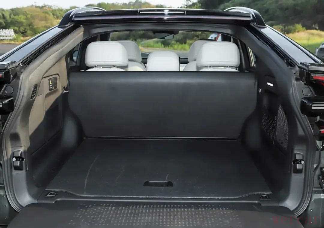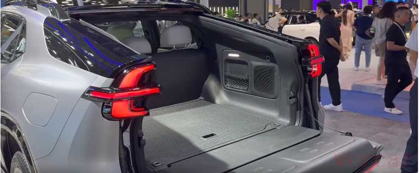 而启源E07的尾箱门,则分上、下两个部分,下方尾门和皮卡的下翻操作相同,上部则是一整块玻璃盖板,可以像天窗一样电动收缩进车顶内,形成和皮卡一样的开放式后斗。同时和前方的乘员舱可以完全连通,后排座椅放倒后,形成一个纵深极长的储物空间。