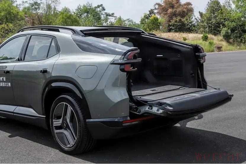 具体到车型上,启源E07的造型、尺寸和定位,和我们熟悉的各类车型都有不同。尾箱完全打开后,状态类似皮卡,但有一个可以完全闭合的顶盖,且和皮卡普遍采用的非承载车身不同,启源E07采用的是承载式车身,且采用前双叉臂、后多连杆的悬架结构,和普通乘用车相似。