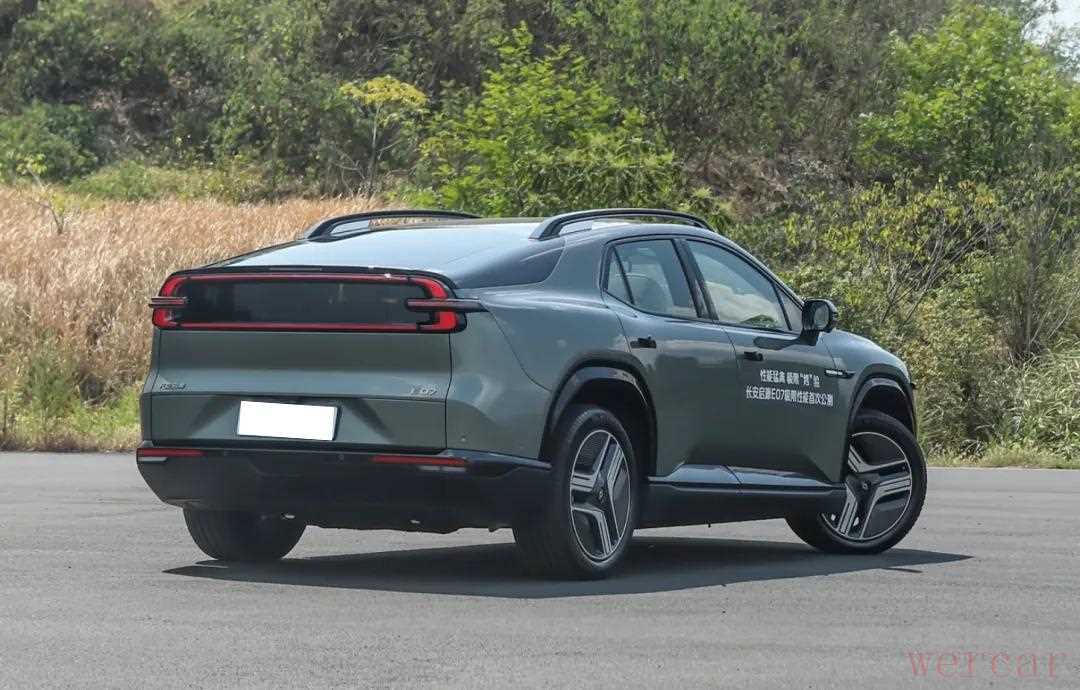 启源E07的离地间隙比普通轿车要高,但从车头到B柱的位置,更接近一台轿车,整体看下来,其实是轿车、SUV和皮卡三种车型的融合体。