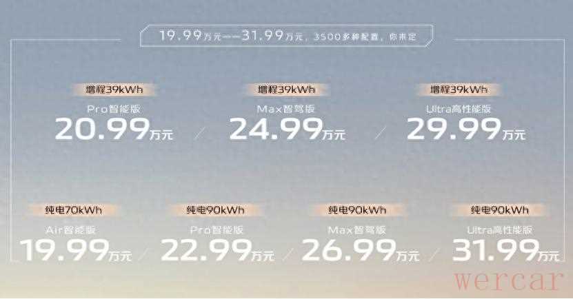 增程版起步价20.99万,四驱版起步价22.99万,同等动力、配置情况下,四驱版仅贵了2万元;纯电版排除配置相对较低的Air智能版,同等配置下,四驱版价格也只比两驱版贵2万元,起步门槛是24.99万。