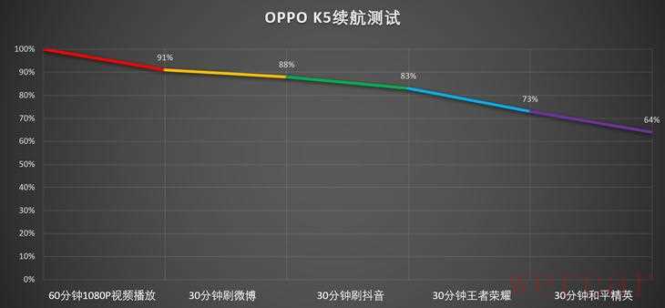 充电部分也是重大亮点之一。K5用上了刚发布的VOOC闪充4.0,充电功率提升到30W,并且还通过算法优化,有效缩短最后10%的充电时间,实际效果非常明显。与之相搭配的为4000mAh电池,实际充电时间如下图。