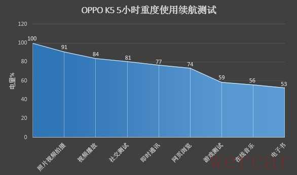 我们通过中关村在线5小时重度使用续航模型进行测试:拍照测试(30分钟)、视频播放测试(60分钟)、社交测试(30分钟)、即时通讯(30分钟)、网页浏览(30分钟)、游戏测试(60分钟)、在线音乐(30分钟)、电子书(30分钟)。