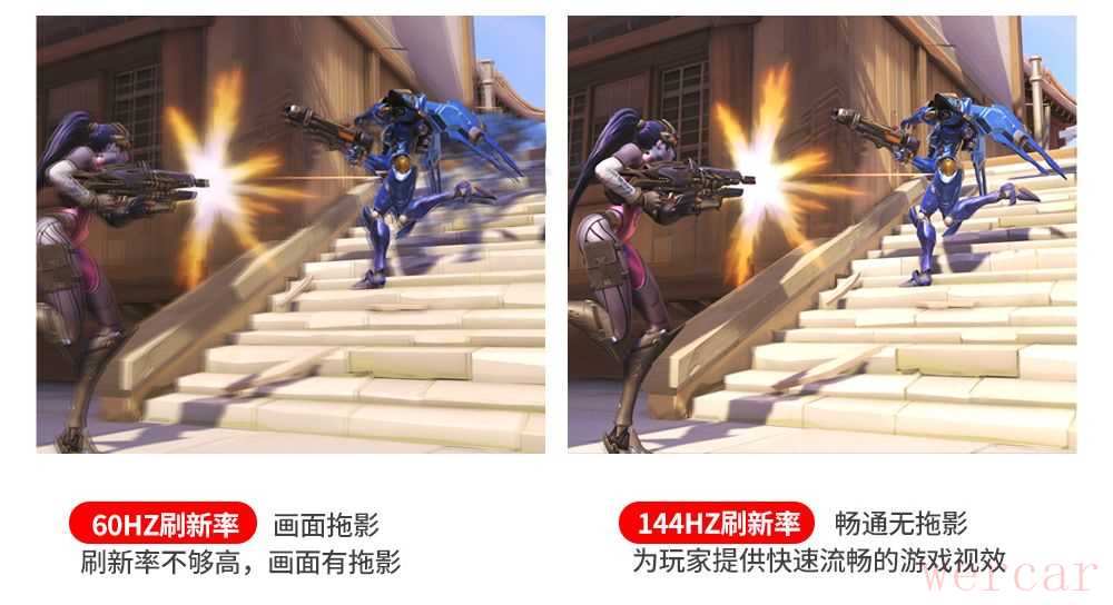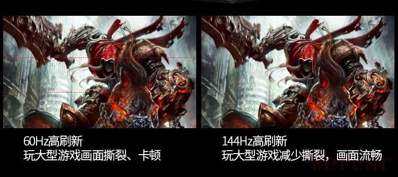 比较有代表性的是为了突显144Hz刷新率的优势,那就要夸大甚至是编造60Hz产品的缺点,所以60Hz显示器画面撕裂、卡顿等问题都来了,这么说来我们用60Hz显示器玩了这么多年游戏,怎么都没发现这么多问题。就拿画面撕裂、卡顿来说,144Hz产品的优势在于在游戏中开启垂直同步之后,画面平均帧速会从60fps提升到144fps,画面帧速更高自然更流畅。既然都开启了垂直同步,无论是144Hz还是60Hz都没有画面撕裂,遇到帧速波动时,该卡顿还是要卡。至于游戏画面撕裂和卡顿问题的解决,这就不是靠144Hz刷新率能搞定的,只能靠G-Sync和FreeSync。