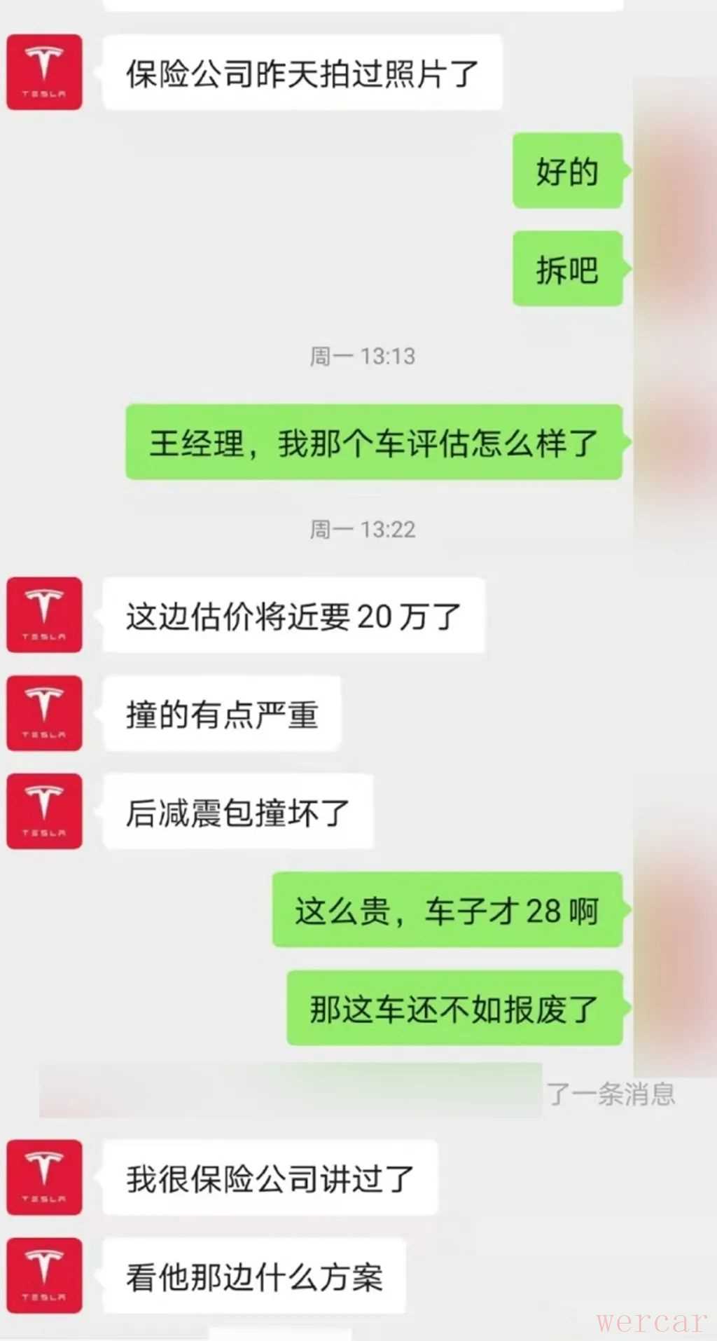 随后该车主又发了一张与官方售后人员的聊天对话截图,从截图来看,车辆的维修费用高达20万,车主表示车辆新车价格才28万,修车就要花20万,还不如报废了事。