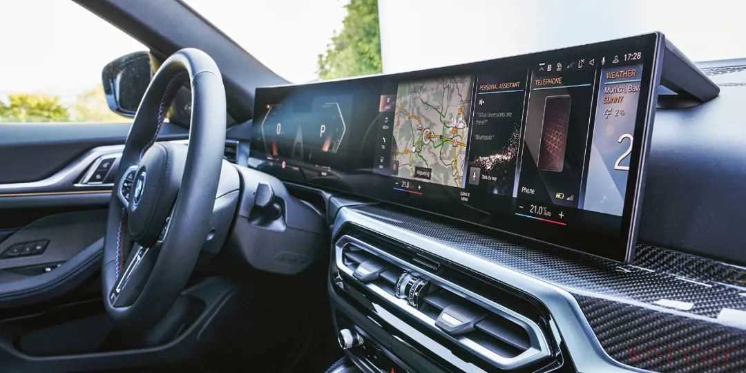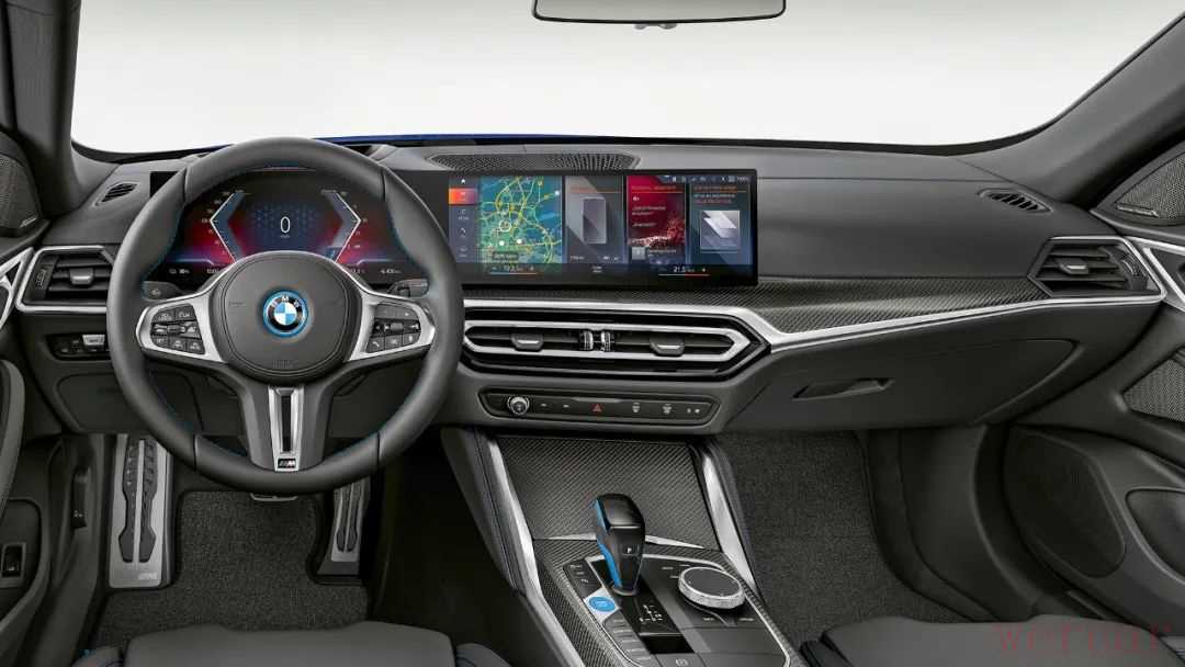 无论高低配车型,i4的内饰均采用宝马最新的设计语言。本质上就是在原本宝马内饰的基础上升级双联屏。一块12.3英寸全液晶仪表,搭配一块14.9英寸中控屏,形成一个曲面的贯穿结构,并且内部搭载了最新的iDrive8操作系统。不出意外的话,之后纯电动i3、中期改款3系等车型都会陆续换上这套内饰风格。
