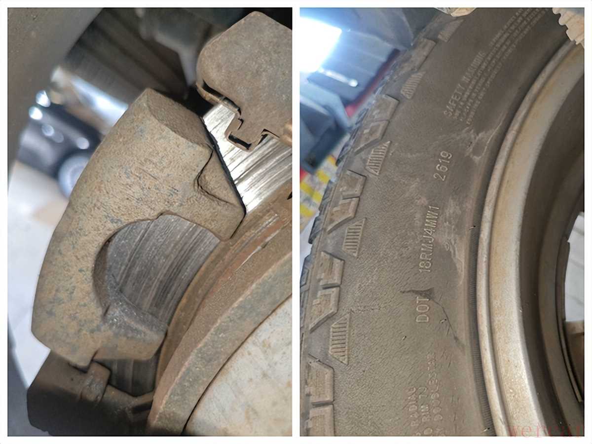 前后悬挂的状态还行,没有老化开裂;轮胎已经换过一次,现在又该换了,侧壁已经有老化龟裂的迹象了;最离谱的是,右后轮没有刹车片,这少了一个刹车,算不算安全隐患?