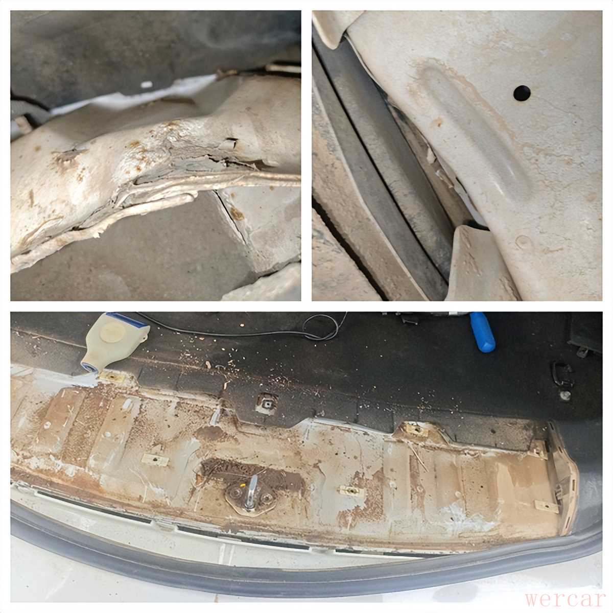尾灯临近的后围板部分变形焊接,面积不大,但也证明后方确实有事故;后备箱底板没问题,不过这么多的泥土,看来之前车主有可能是干工程的。