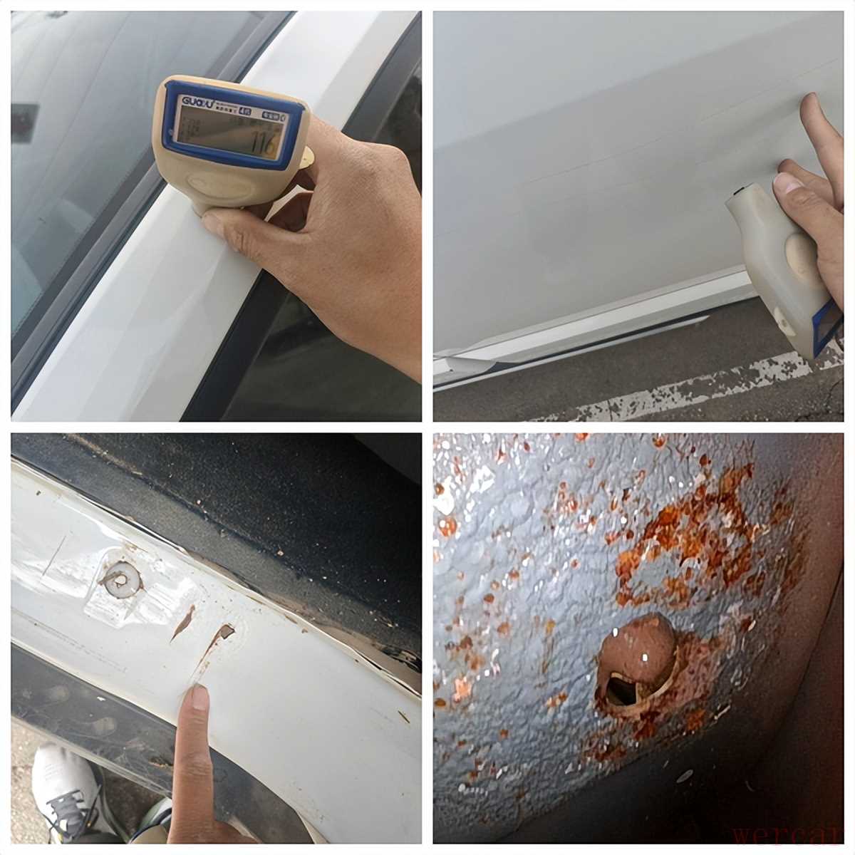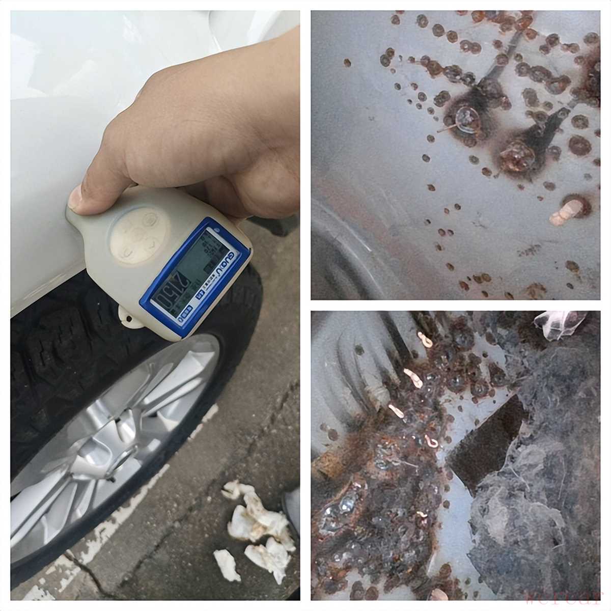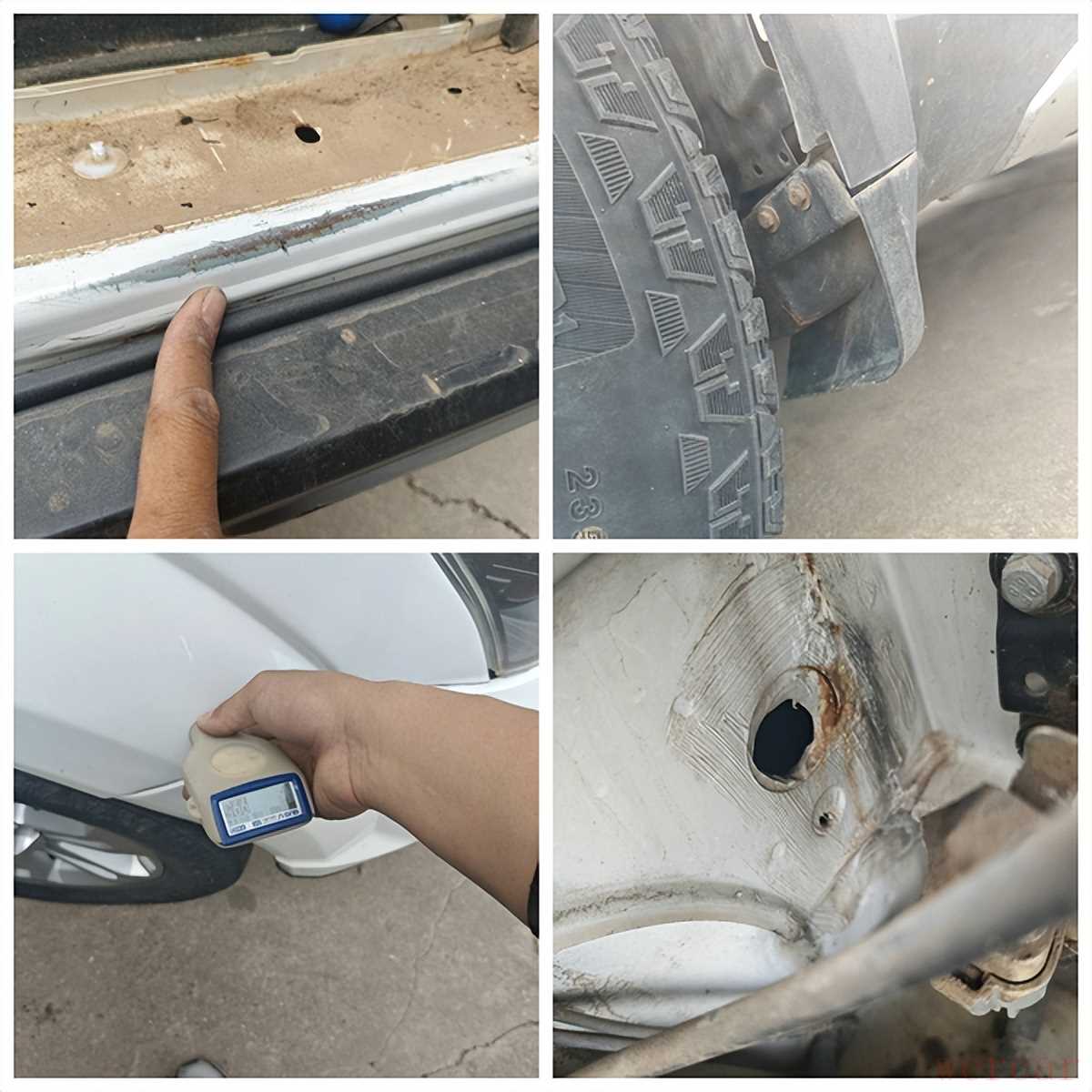 左后翼子板的漆面厚度干到了2000多μm,里面骨架大概10厘米的烧焊痕迹,临近的轮旋也有小变形,应该是之前发生了事故,找了个小修理厂修的,内部修的很差劲,跟煤蜂窝似的。