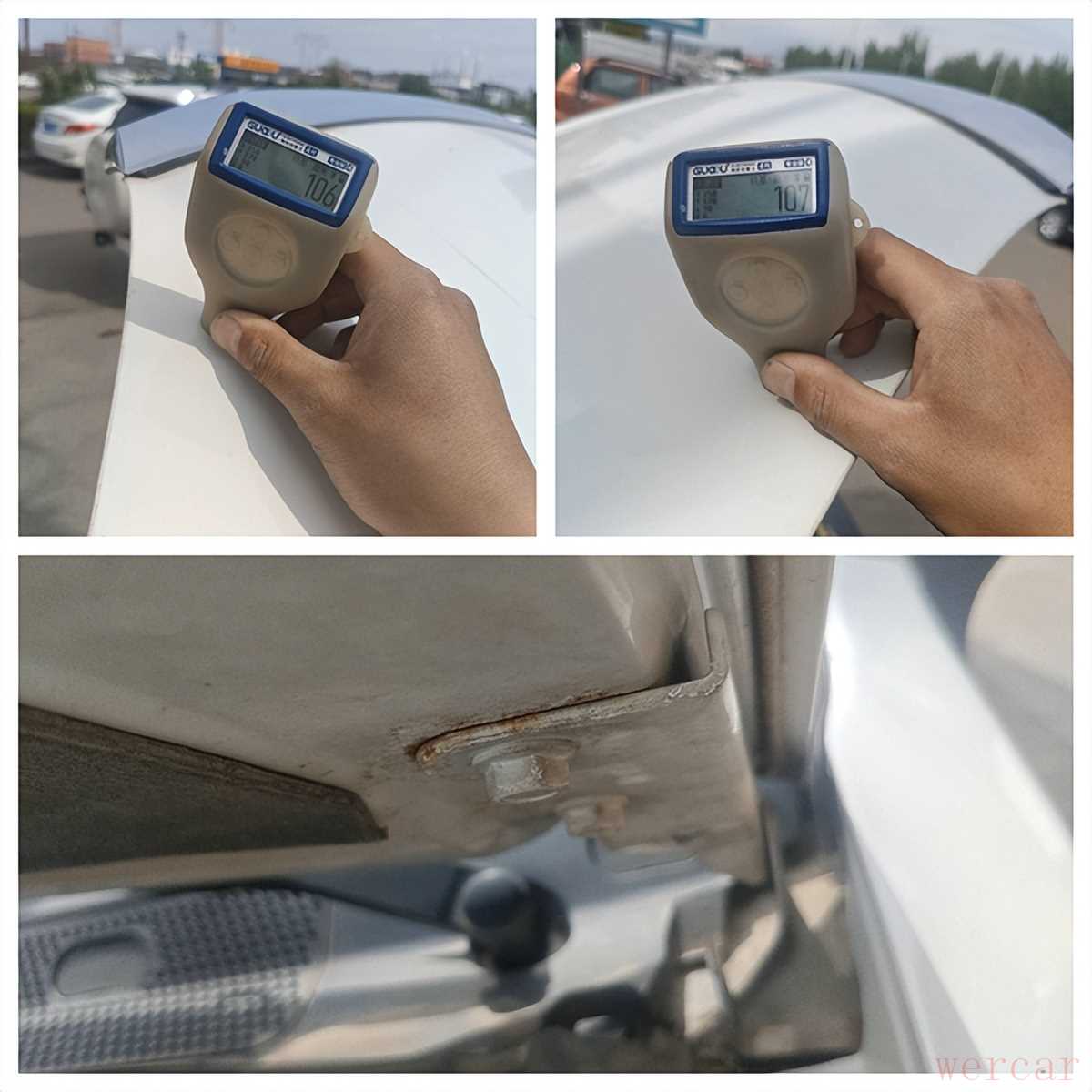 往后看机盖,猜测机盖的问题不大,但没想到,一点喷漆都没有,漆膜厚度100μm-110μm区间,分布很均匀,内侧铰链螺丝也没有动过,只是漆面有些小划痕小凹坑。