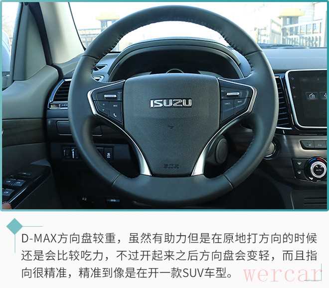 有的朋友可能就问了,为什么是起步之后很轻便,起步之前呢?很沉吗?答案是肯定的……原因就在于D-MAX的方向盘调校偏向于沉稳的风格,尤其是原地打方向的时候比较吃力。
