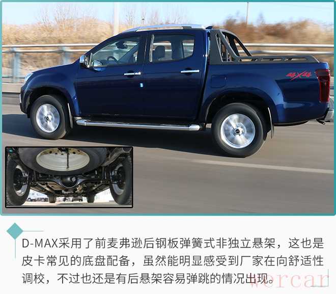 钢板弹簧式的后悬架在过一些较大的颠簸时会出现比较明显的弹跳,这是结构所带来的弊端,不过皮卡作为工具用车在满足装载重物的条件之后才能考虑舒适性的问题,所以我们也不能过分要求。D-MAX的悬挂还是挺硬朗的,并且韧性也比较足,支撑性一般,从底盘这方面来说还是标准的皮卡特征。