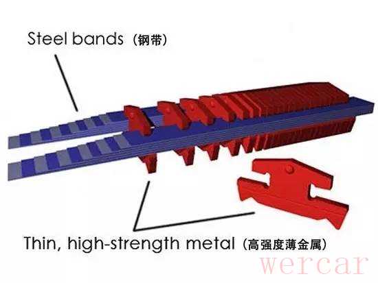 从图上就应该能看出来了,CVT上用的钢带并不是咱们理解的普通钢条或者钢片。它是由无数个高强度的薄金属片连接成的,我再给你看一张大图: