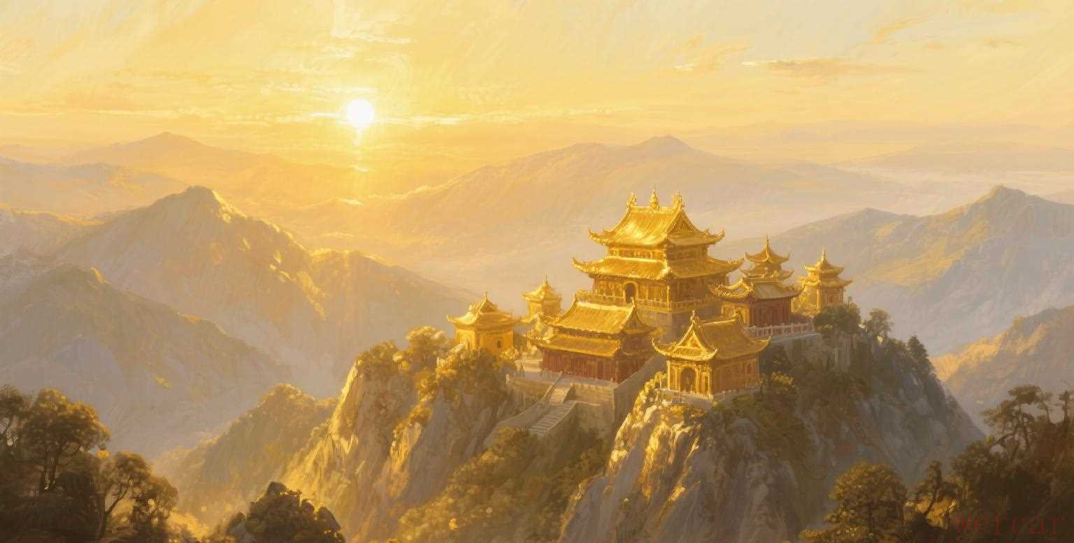 "金顶道观:" 老君山金顶是景区的精华所在,海拔超过2000米,山顶建筑气势恢宏,金碧辉煌,尤其在阳光照射下,熠熠生辉,宛如天宫。