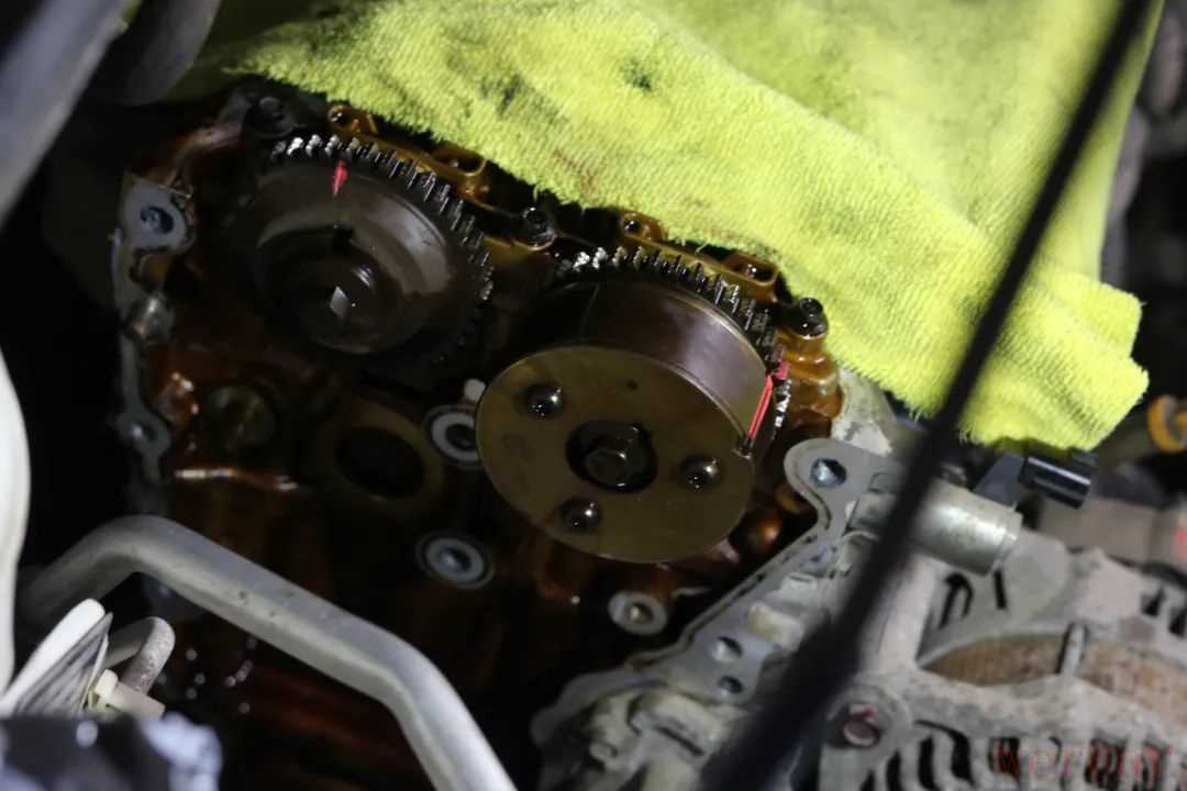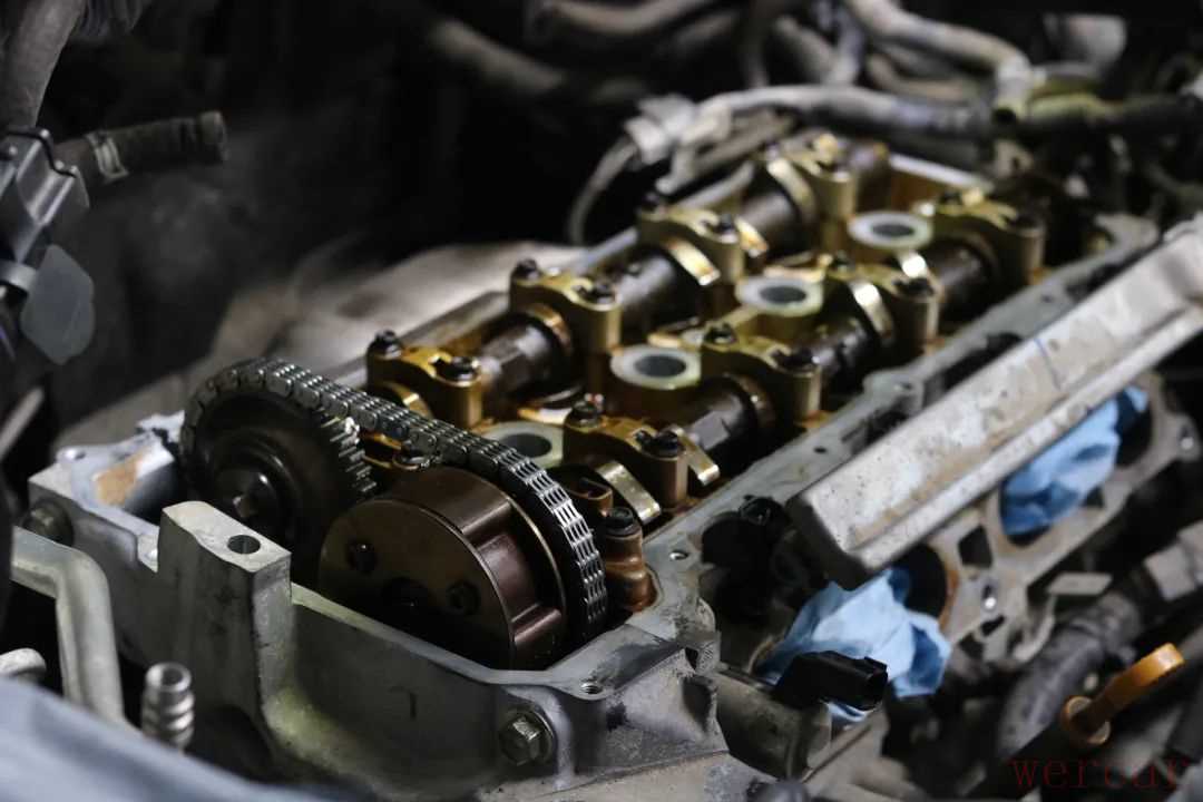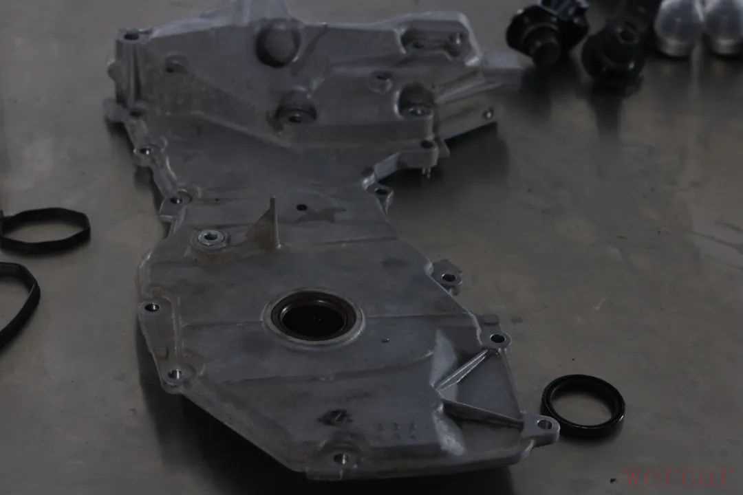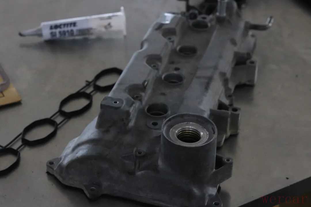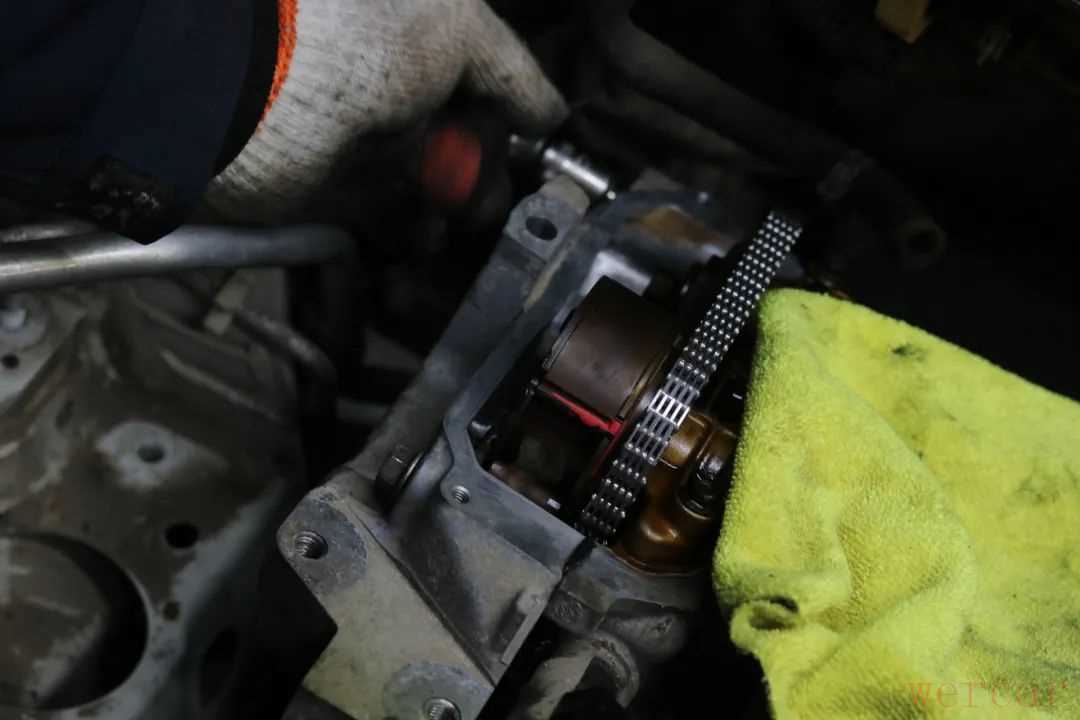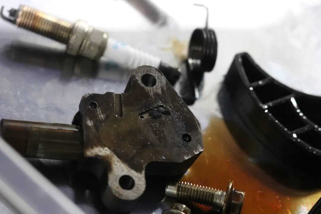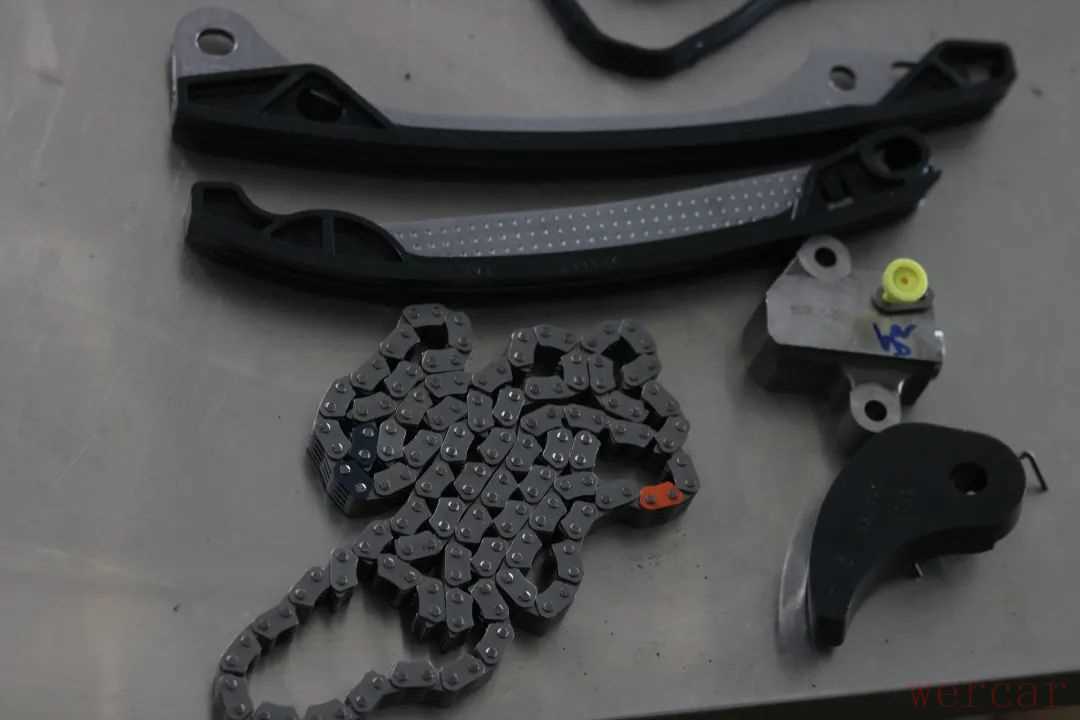 还有正时链条、张紧器等配件。发动机的噪音问题,来自正时链条,严重松旷了,已经在气门室盖上有磨损的痕迹了,所以噪声特别大。