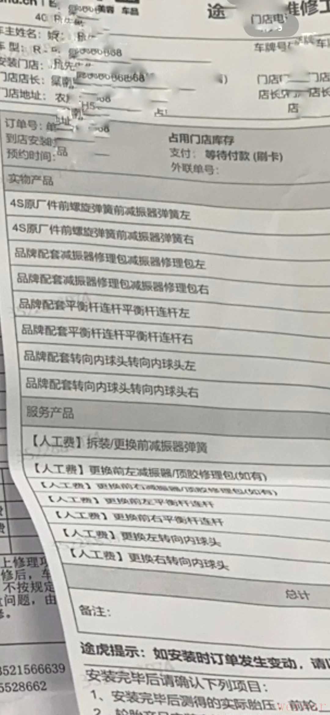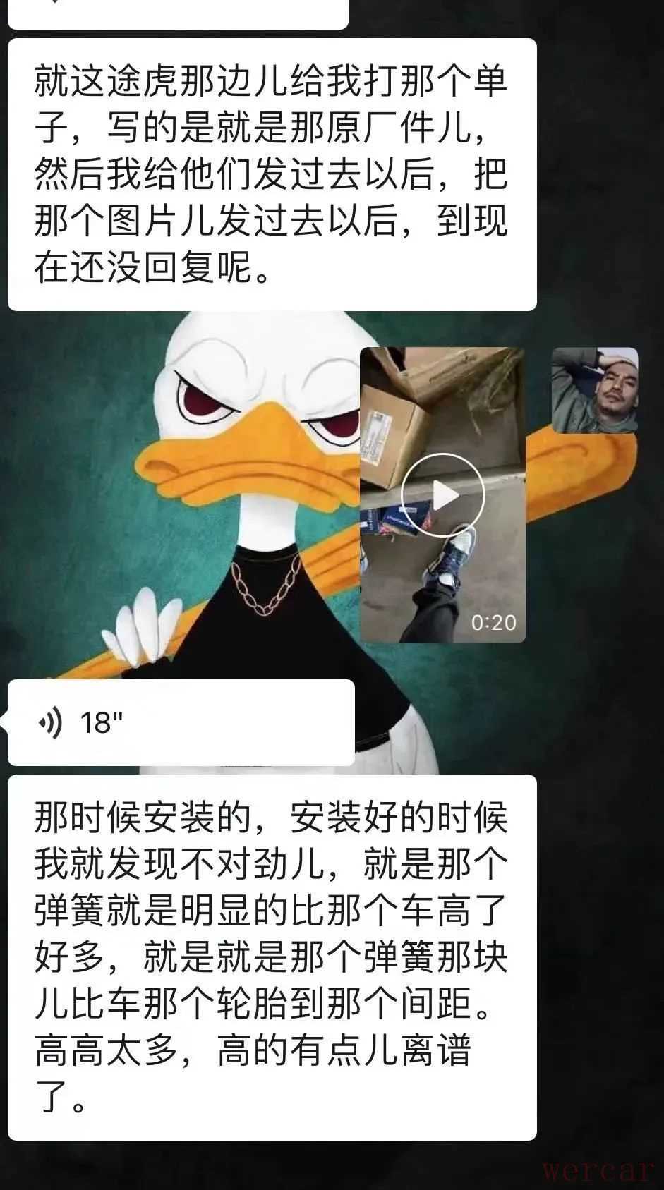 车主说当时安装好的时候就感觉不对劲了,但是没有证据,这下咱们提供证据了,车主发过去后,某虎那边哑口无言了。为什么很多店给客户换减震器会连着弹簧一起给换了,因为他们换的是打包总成件,就是塔顶+防尘套+缓冲块+减震器+弹簧全换了,来货的时候,这些都已经安装好了,它们不是单独配件,都是提前组装好的,店家只需要往车上一怼就完工了。