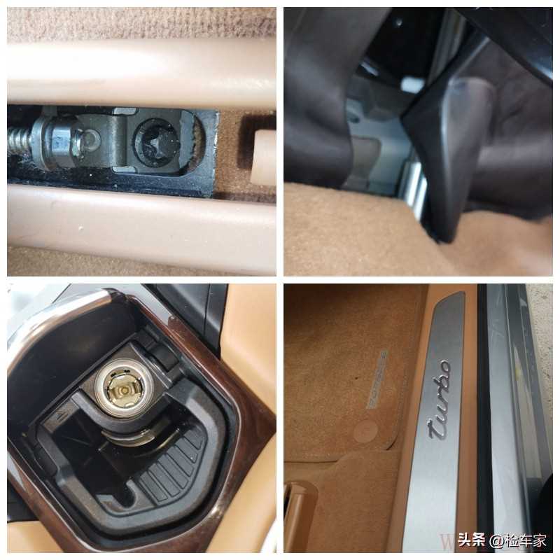 内饰细节部分,检查到驾驶座椅骨架没有拆卸和生锈痕迹;转向管柱光洁如新;点烟器座也是干干净净的;门槛地毯也没有异常情况;结合其它细节可以排除车子的水泡嫌疑。