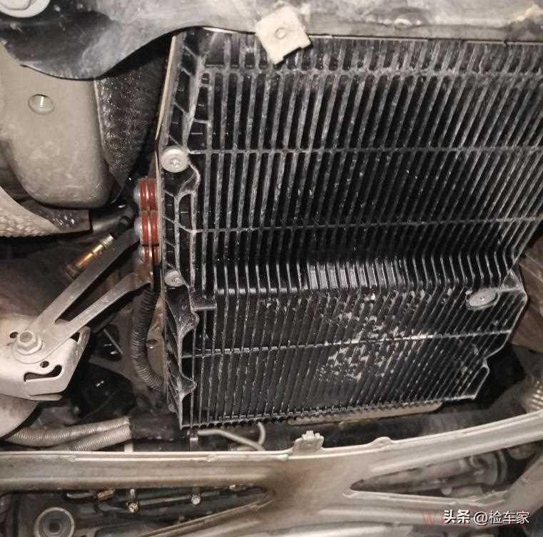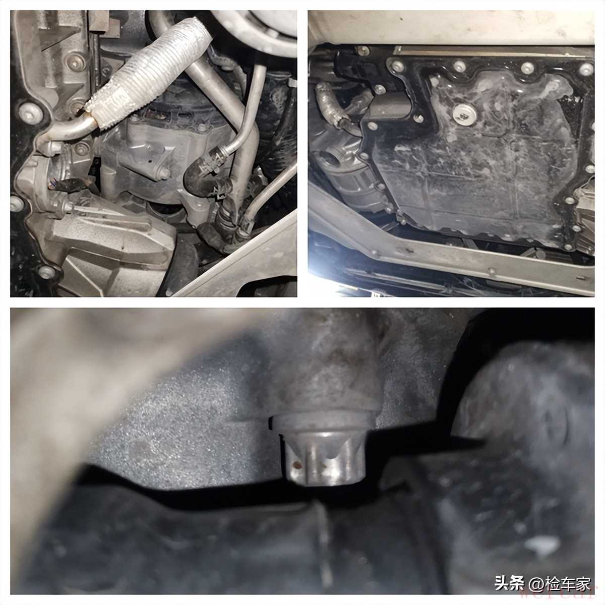 接下来拆掉底护板,发动机和变速箱就完美呈现在我眼前了。检查发现发动机总成,发动机油底壳干净整洁,没有渗油的痕迹,发动机变速箱连接处螺丝也没有拆卸痕迹。