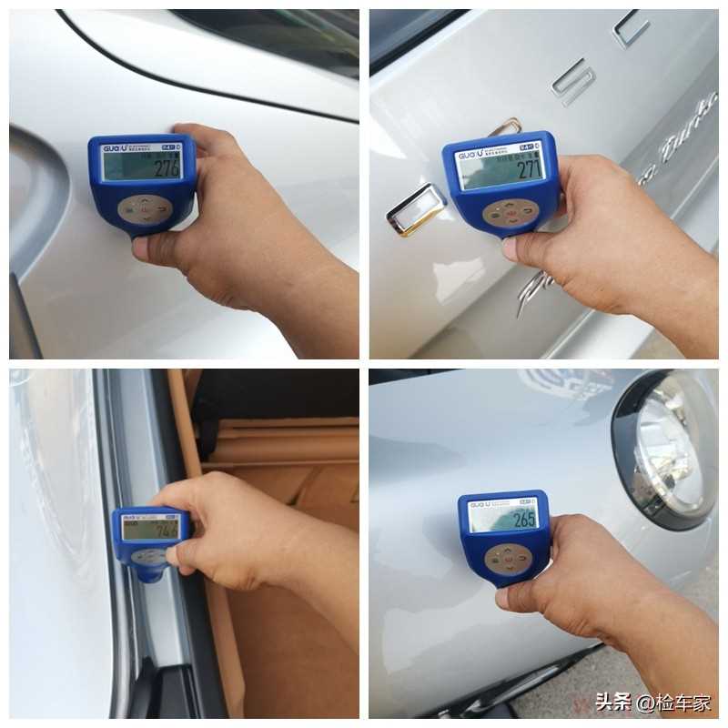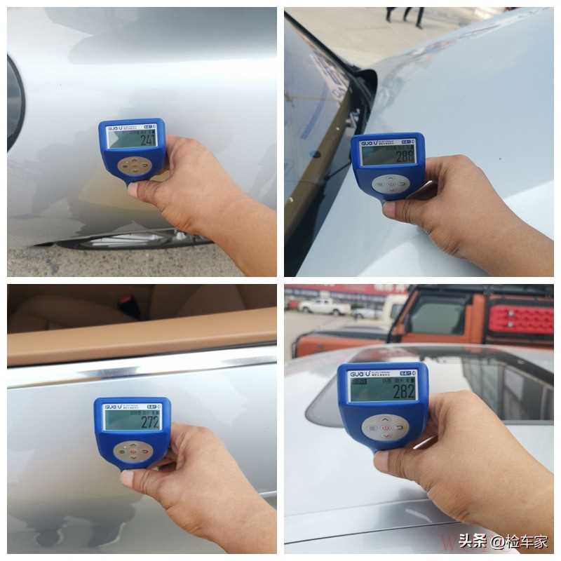 随后依次检测到左前翼子板、前机盖、左前门和左侧车顶的漆面数值均为200多微米,原车漆大概在100多的样子,加上车衣的厚度,200多的数值是正常的,说明这几处外观件都是没有修复过的。
