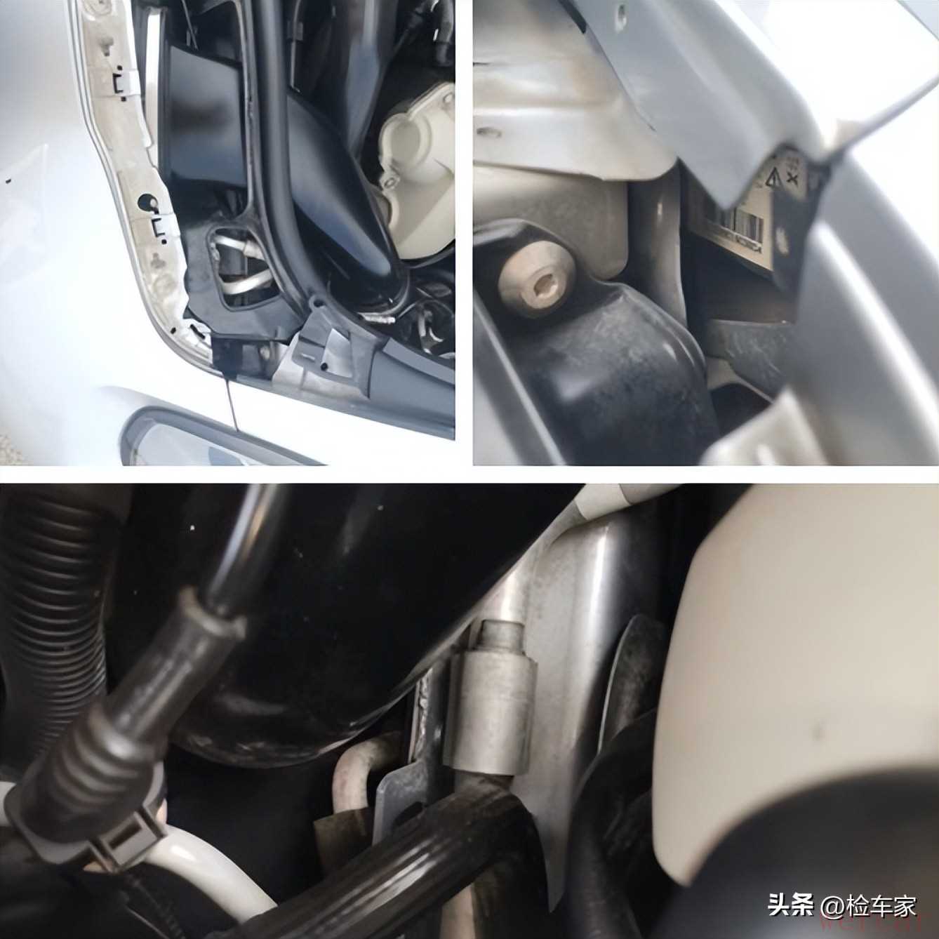 机舱部分首先检查到机盖和翼子板内侧螺丝以及结构件均无拆卸的痕迹,纵梁的梁头位置也没有钣金修复的痕迹,结合外观原版原漆的情况可以排除车辆出过重大事故的嫌疑。