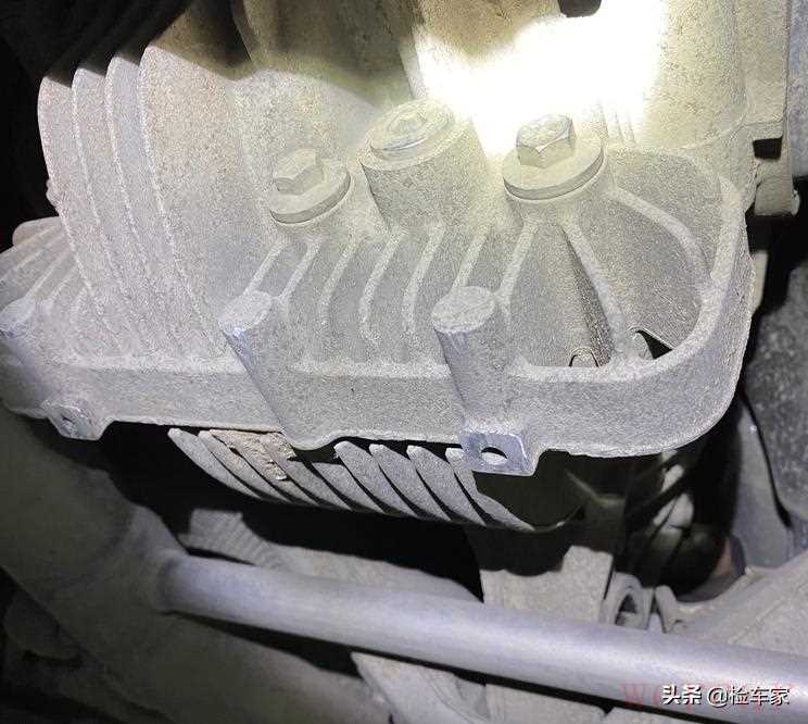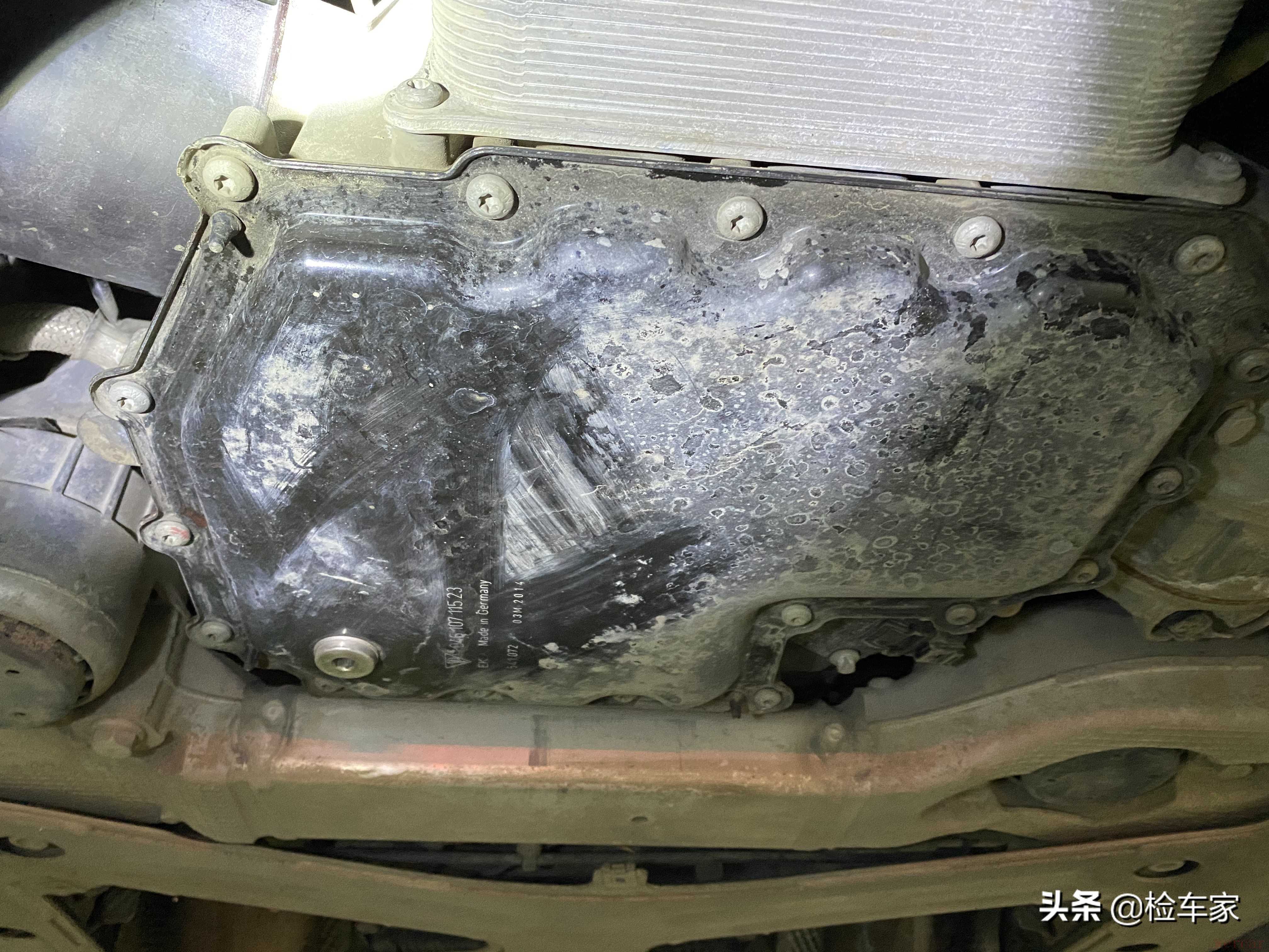 路试完后就在车行上了架子,底盘大护板有轻微的剐蹭,倒没什么影响。经卖家同意,三五两下就把护板拆下来,看看发动机下部有无拆卸维修或漏油的情况。