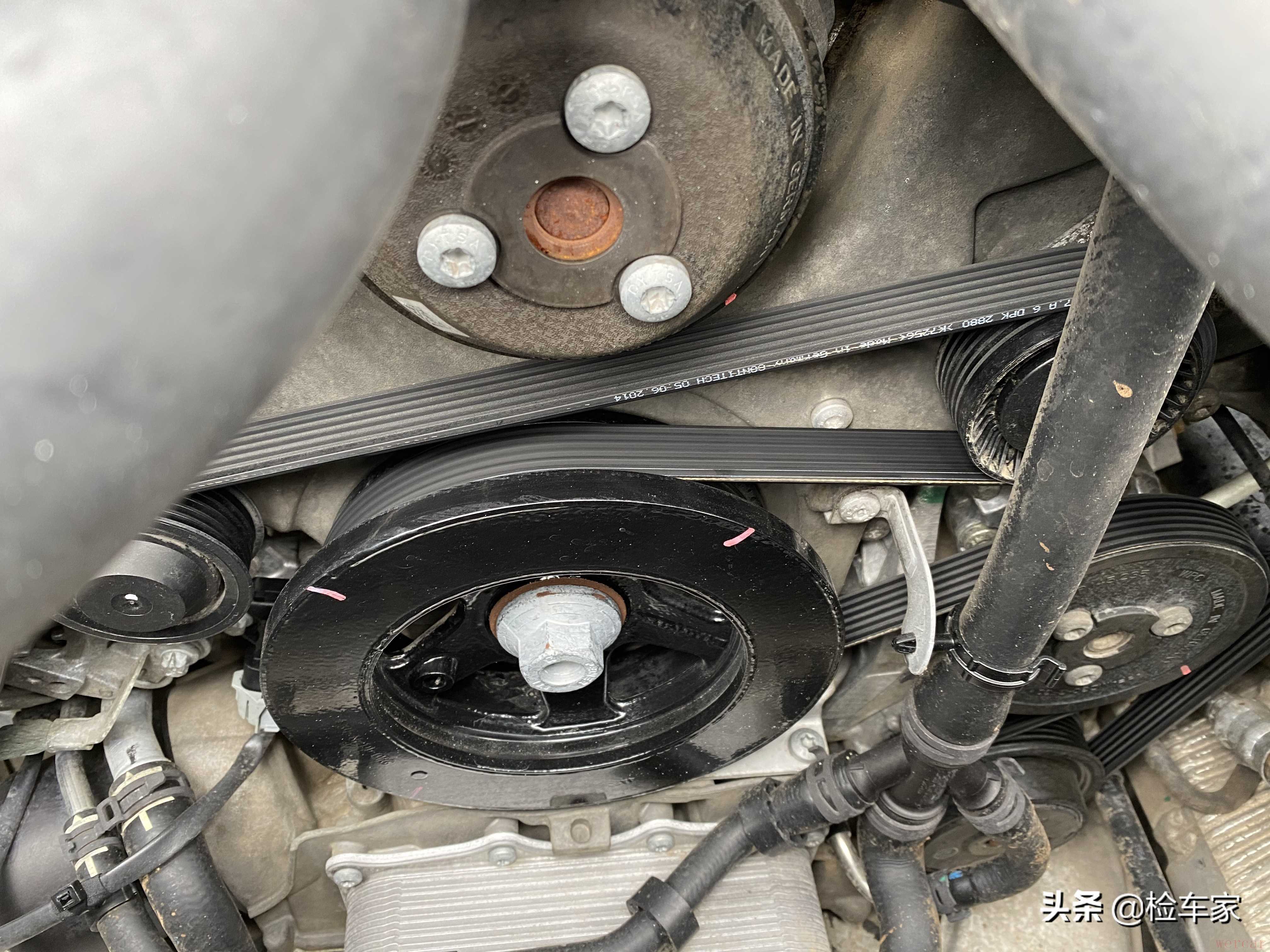 发动机前部偏盖以及大轮水泵轮固定螺丝无任何拧动拆卸痕迹,表面也无任何油液渗漏,皮带及水管无老化,目前依然可以正常使用。