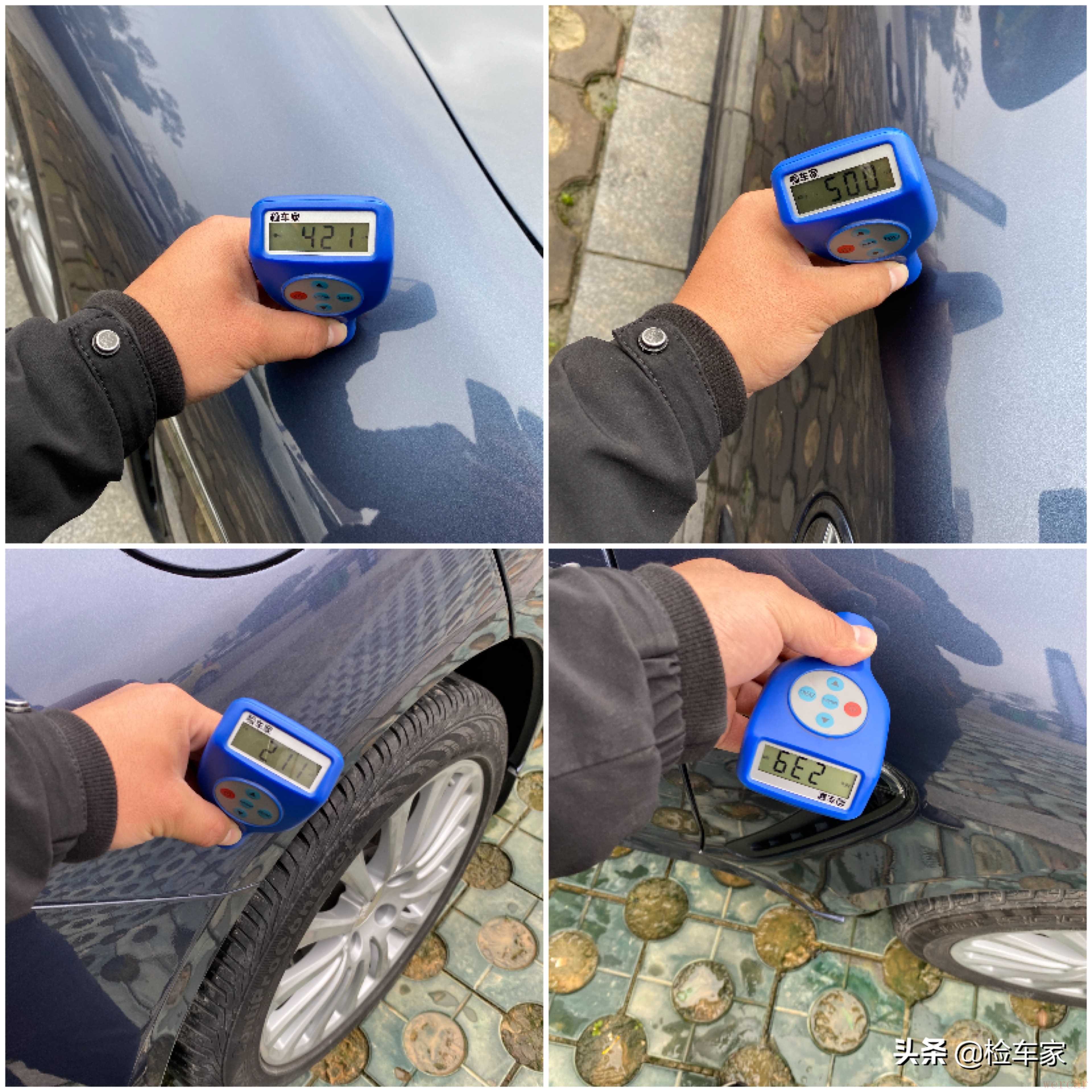 来看漆面,车身有两处钣金修复,分别是左前叶子板和左前门位置,钣金程度不严重,应该是左前有过小剐蹭。其它漆面,除车顶机盖跟后背盖以外,一圈都有喷漆情况,可能是划痕做的喷漆。