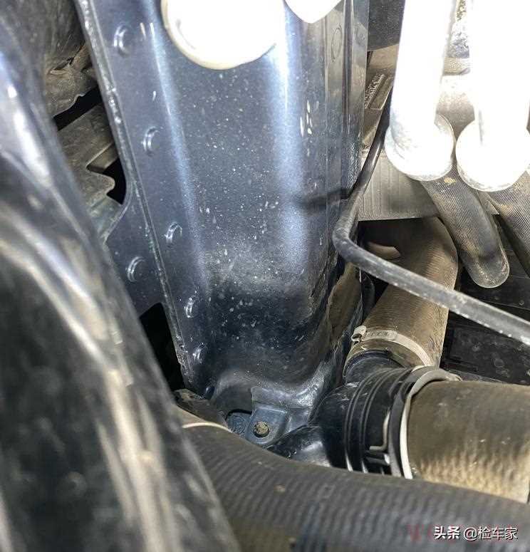 右前大灯更换了,前部的排查就要更严谨一些,要判断是否是事故造成的大灯碎裂更换。仔细观察前杠内侧水箱框架、水箱、冷凝器和前防撞梁,都未发现异常修复或更换的情况;左前大灯是原厂的;纵梁表面漆面自然平顺,无焊接修复变形等情况,原车焊点均匀,基本上排除了前部事故的嫌疑;右前大灯更换可能是大灯保修或者线路问题的原因。
