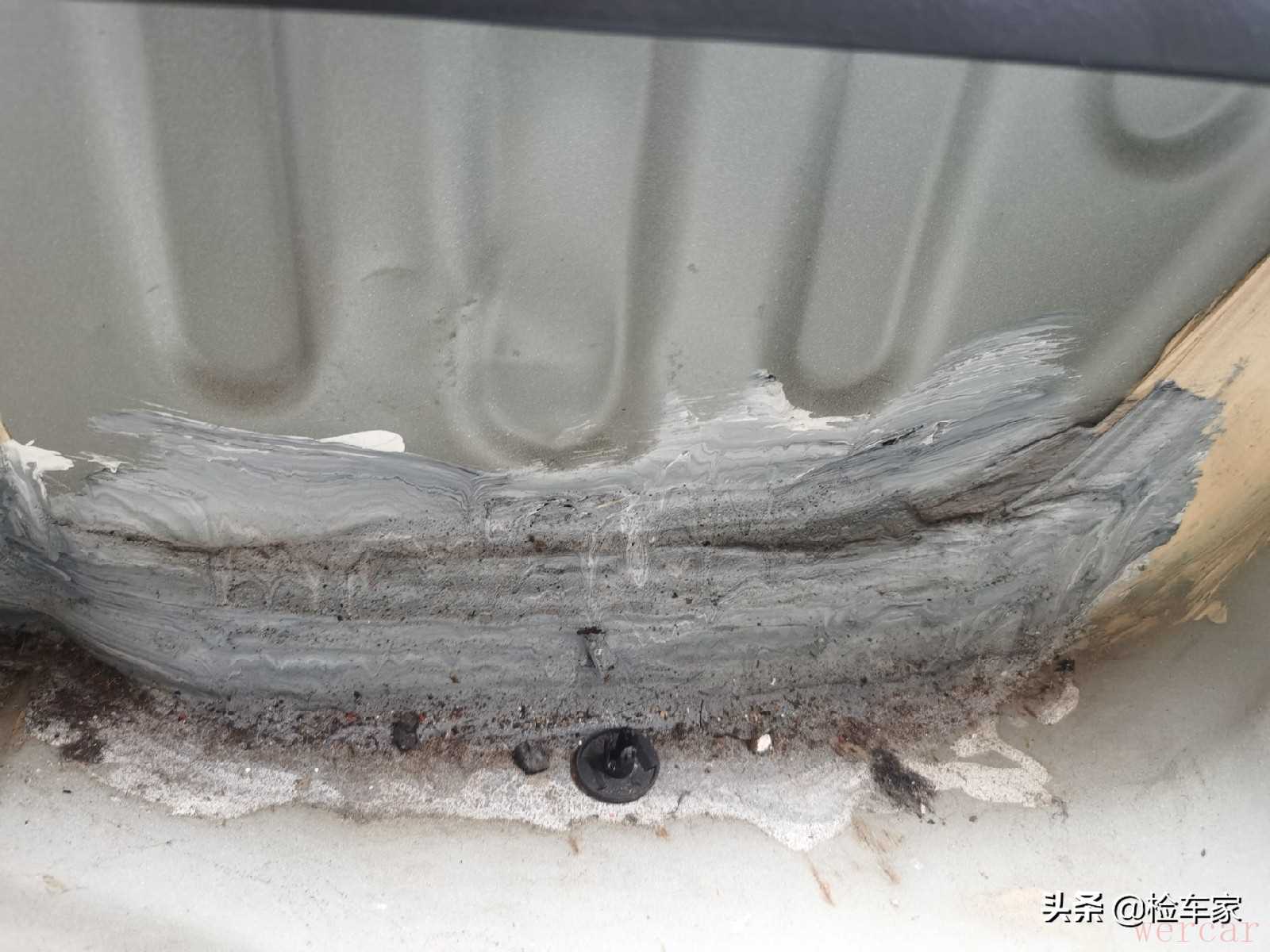 来到后备箱,看到后围板发生了明显的变形,而且后围板和地板连接处应该还开裂了,维修时为了防止漏水还打上了厚厚的一层胶。看来后部有追尾,而且撞得不轻。看到这样的情况我估计底盘下面应该也有损伤修复,这就需要把车子顶起来了。