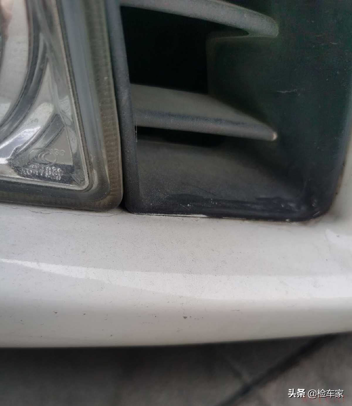 右前雾灯黑色饰板的边缘有一道白漆,说明下方的保险杠有过喷漆。这种塑料件因为漆膜仪测不了数据,所以都是凭借肉眼和经验去检测,只要有过喷漆它都会留下蛛丝马迹,仔细检查总能发现端倪的。