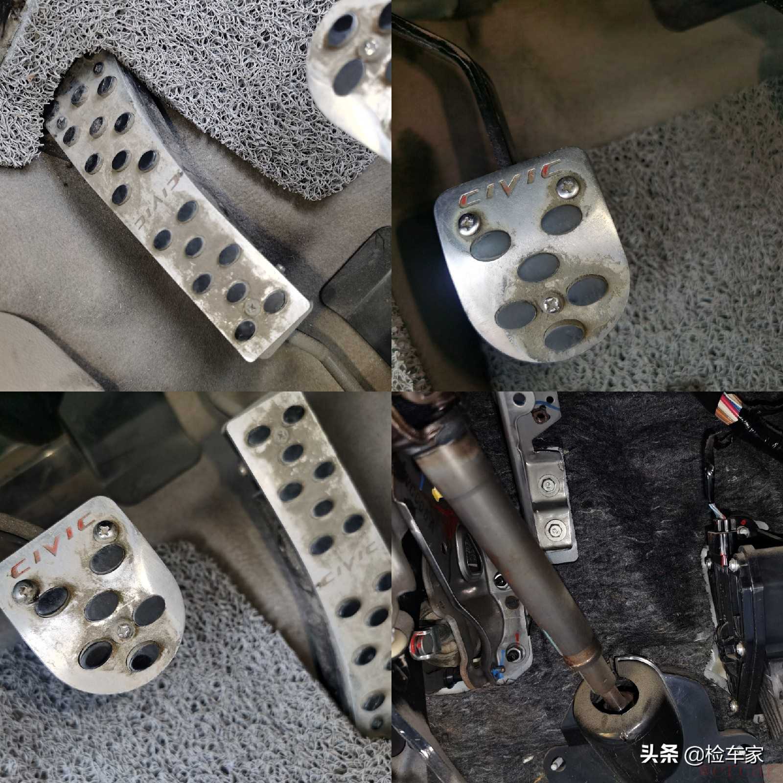 如果说座椅的磨损让我对调表的怀疑有七成的把握的话,看到脚下的三个踏板直接增加到了九成。因为长时间的使用,三个踏板经常受力的地方已经掉漆了,这种磨损最少有20万公里了吧!同时也检查了方向管柱没有生锈拆卸的痕迹,再结合之前座椅底部及内饰地毯的检查,基本排除了水泡和火烧的可能。