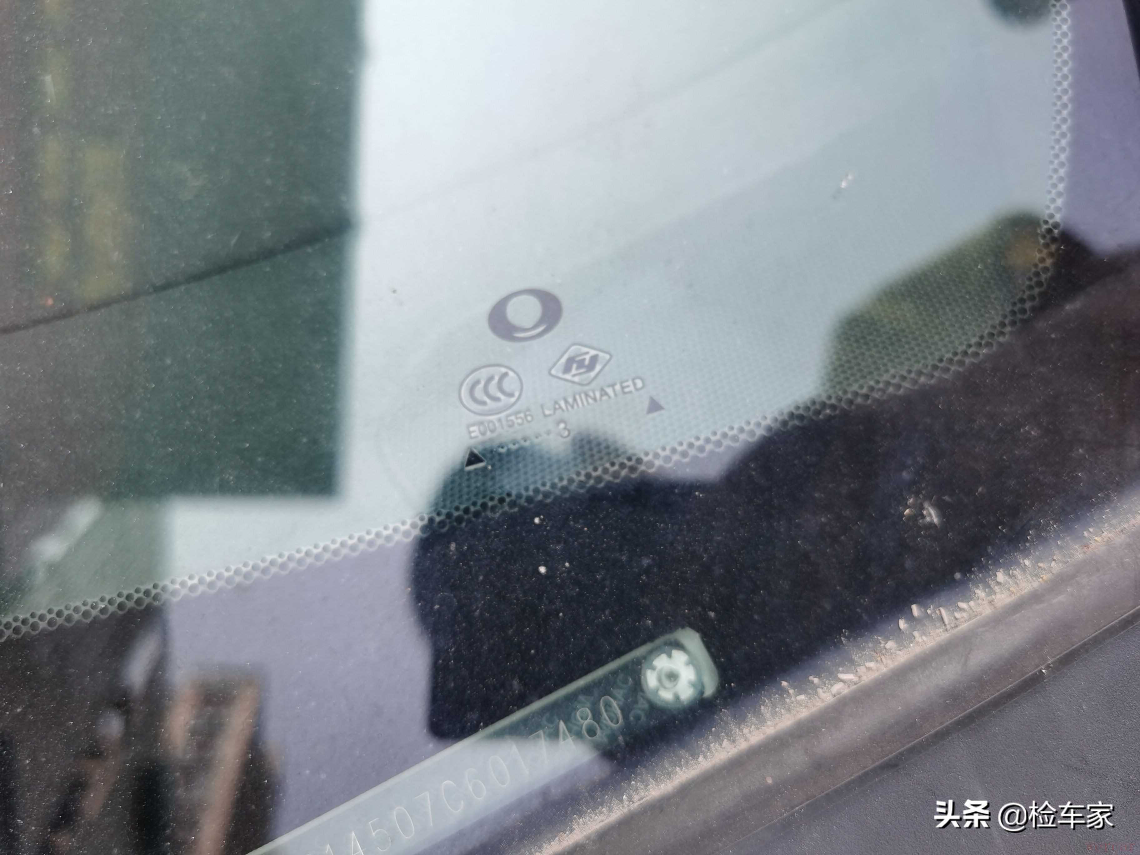 前挡风玻璃的制造日期符合车辆出厂时间,检查玻璃边缘打胶情况没有发现异常,判断为原厂玻璃。但是玻璃中部位置有一点瑕疵,应该是在行驶过程中被什么小东西磕到了,导致玻璃有点小破损。