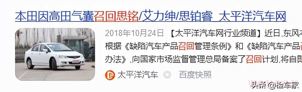 这个疑问一直留到了晚上回家,直到我搜索了一下思铭有没有召回的新闻,就看到了大名鼎鼎的高田气囊。不难理解,思铭用的都是本田的配件,而本田大量采用了高田气囊,所以召回更换的时候必然也有思铭名列其中。