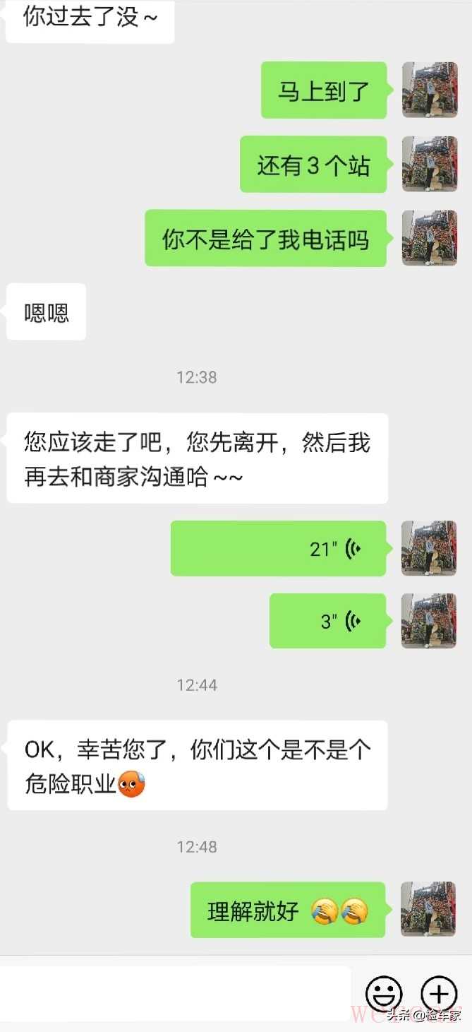 在分享干货之前先给大家看一下大师兄和客户的聊天记录。从中不难看出,这次检测的车,车况不怎么样,以至于如实汇报车况之后,客户都担心大师兄的人身安危,认为我们是危险职业。其实做了这么多年的二手车检测师,车商的冷眼和辱骂我遇到过不少,不过经历得多了也就释然了,毕竟人家的生意没得做了,而且一般也不会对你动手,车商对我们可以说是又爱又恨!