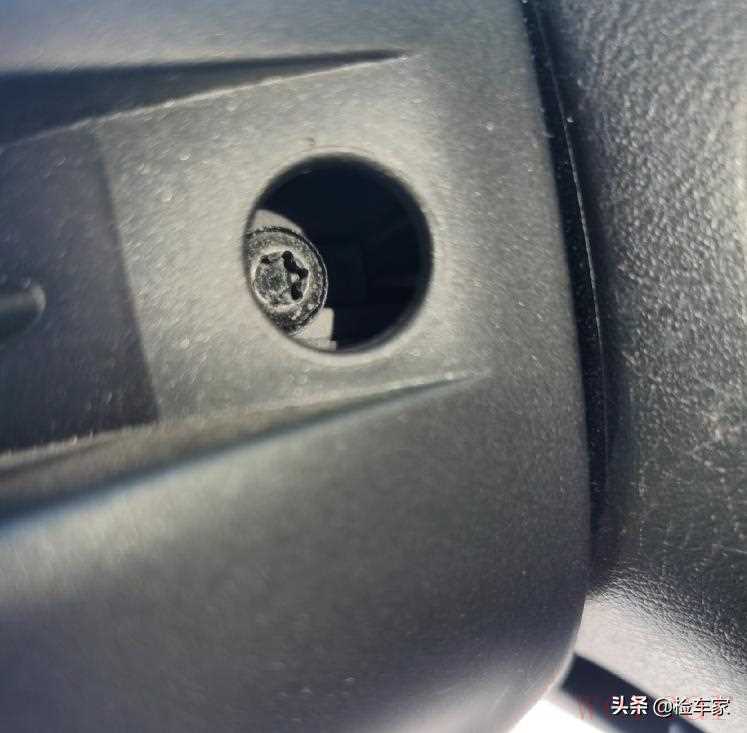 气囊的检查当然也少不了,只需要拆掉方向盘背部的两个盖板就能看到固定主气囊的螺丝了,螺丝内部有双向受力扭动的痕迹,而且只要有光照过去,就能看到有痕迹的地方比没有痕迹的地方要亮很多。这是因为这种螺丝表面都喷了一层黑色的漆,而这个螺丝被扭动后就破坏了表面的油漆露出来里面的金属,所以才导致光一照过去就能看到明显的反光。