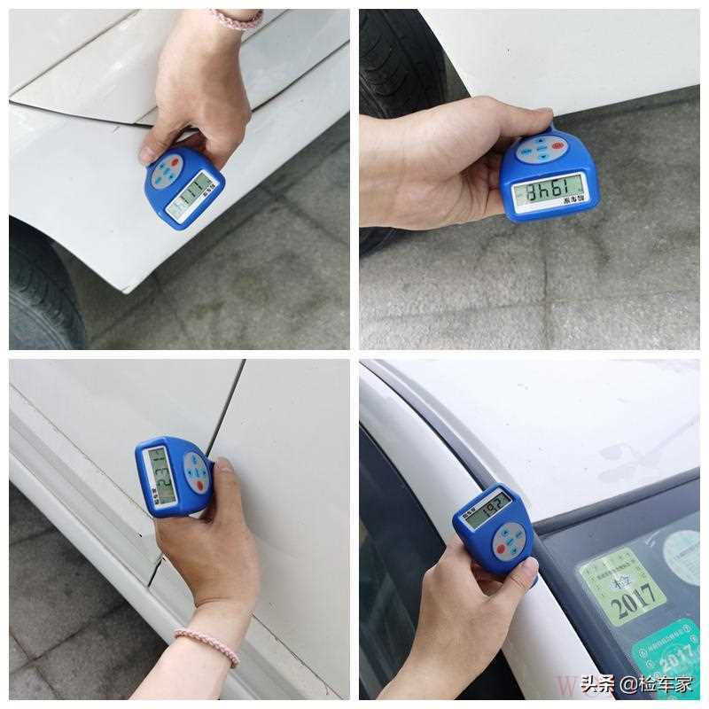 右边的检测也顺利地进行了,右边的几个面都有喷漆,车顶也有喷漆。这样外观情况基本就弄清楚了,几乎全车喷漆,左边的叶子板,前机盖,左前门,左后门,左后翼子板,后备箱盖,右后翼子板都做过钣金,剩下的就都是喷漆,包括两侧的上下边梁和ABC柱。