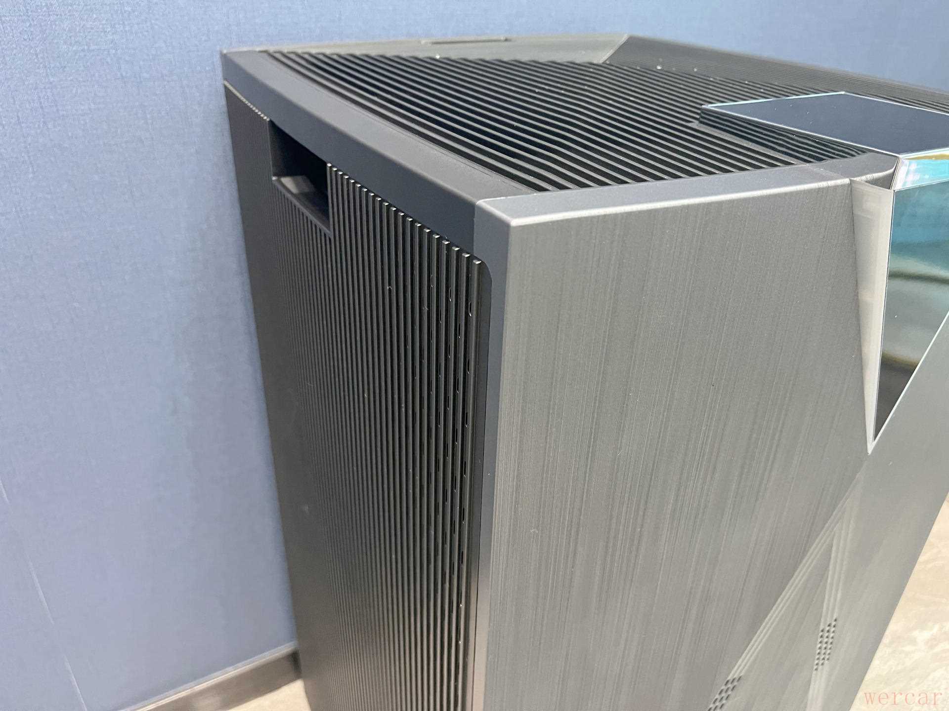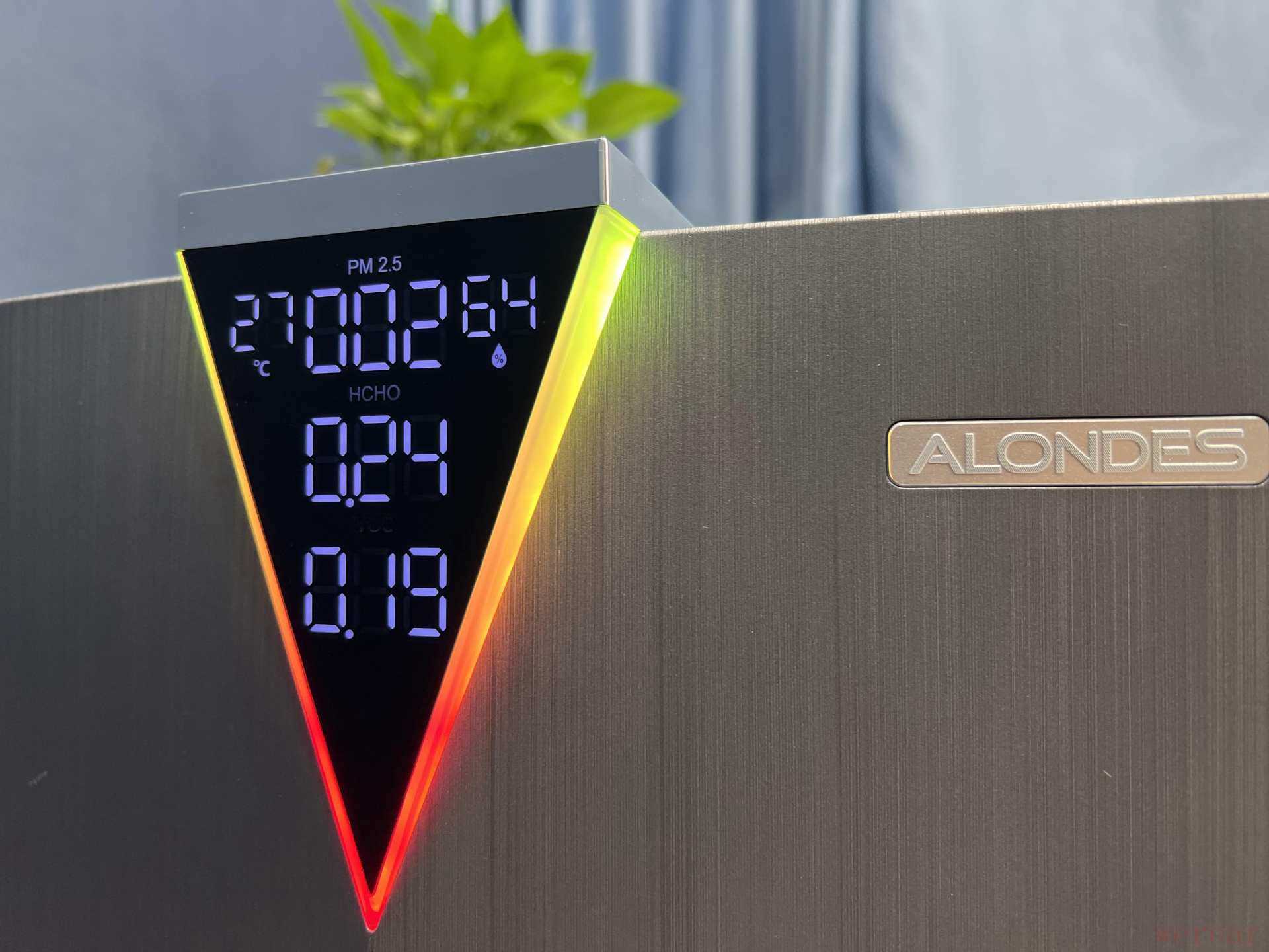 这块三角形的显示面板是凸出于机身的,很有设计感,在显示面板上可以显示PM2.5、甲醛、VOC和湿度等空气信息,显示功能还是比较齐全的,在开机的情况下还可以设置24小时内的定时,每按一次增加一小时。面板采用金属拉丝工艺,经过127道工序流程制作出如超跑车身上的碳纤维机身质感,显得比较有高级感,在右上方有一个产品的logo。
