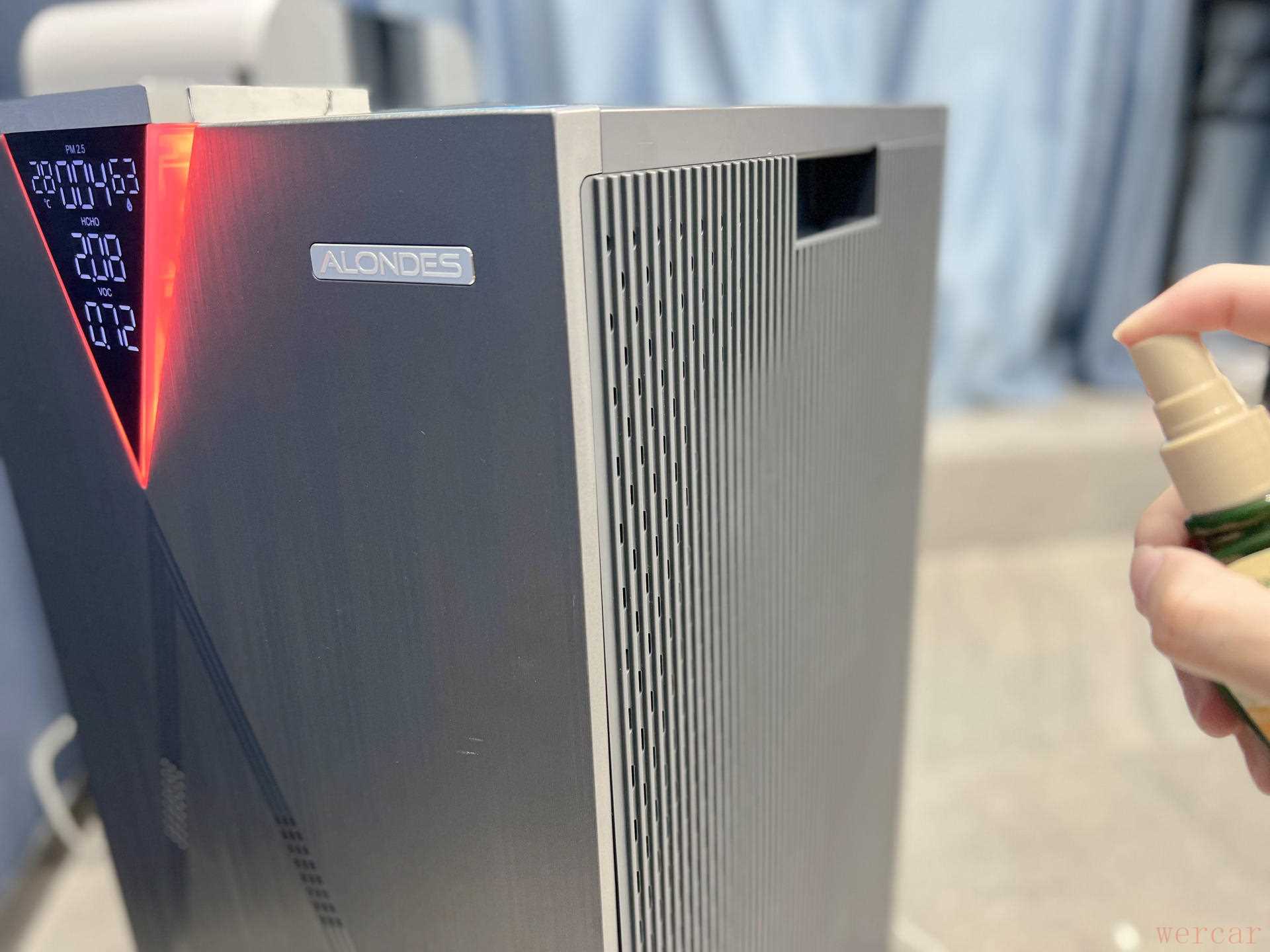我用喷雾来模拟了一下紧急情况,当空气中有有害气体时显示屏的边框会变为红色,不过开着净化器很快空气各种指标就变为正常了。