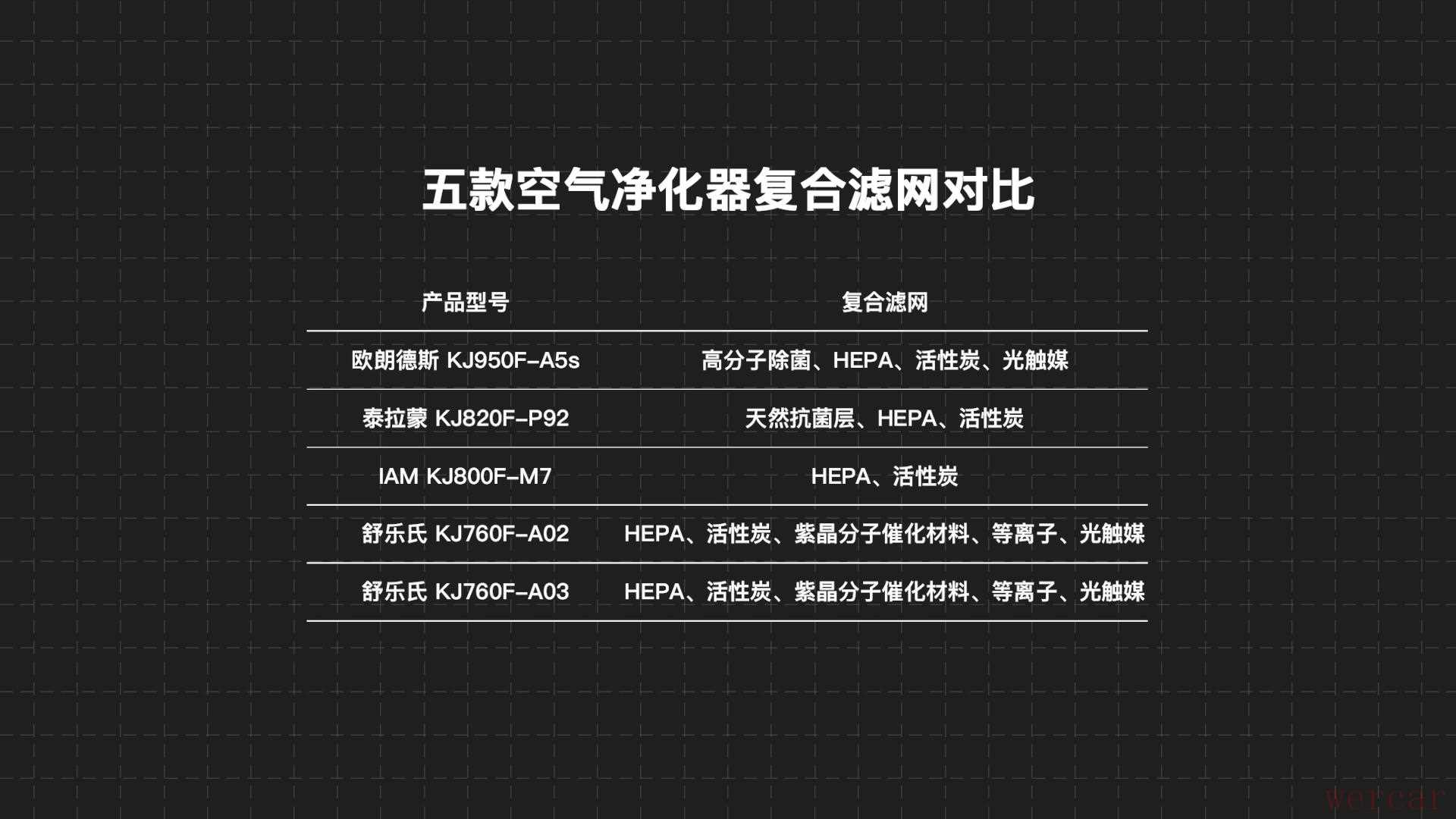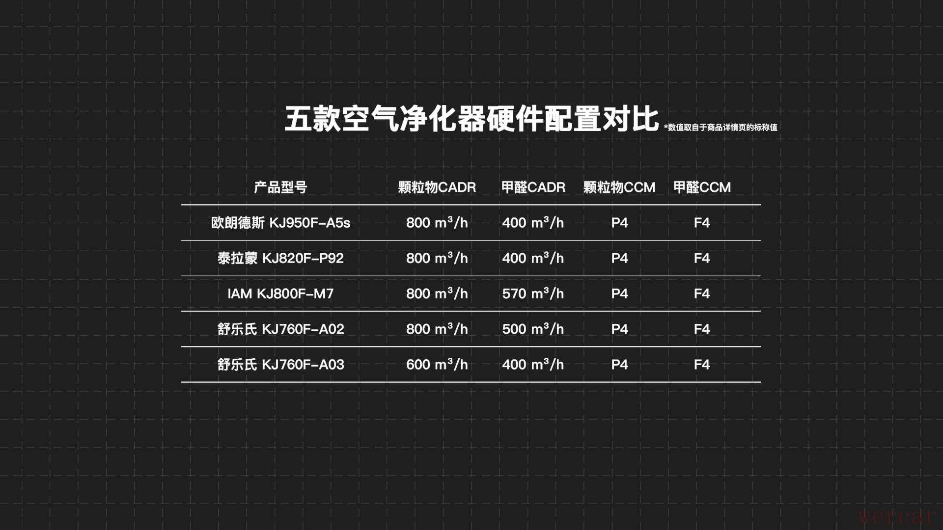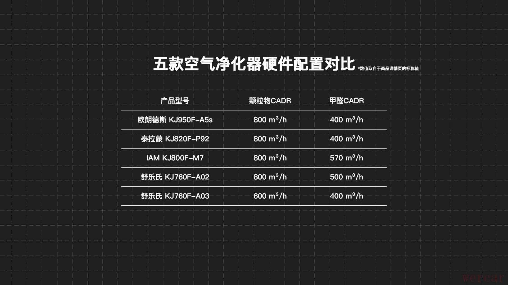 对于一台空气净化器来说,最重要的硬件参数自然是风机和滤网,也就是CADR值和CCM值。这里我们将五款产品的CADR和CCM数值整理为了表格,有需要的朋友可以保存一下。