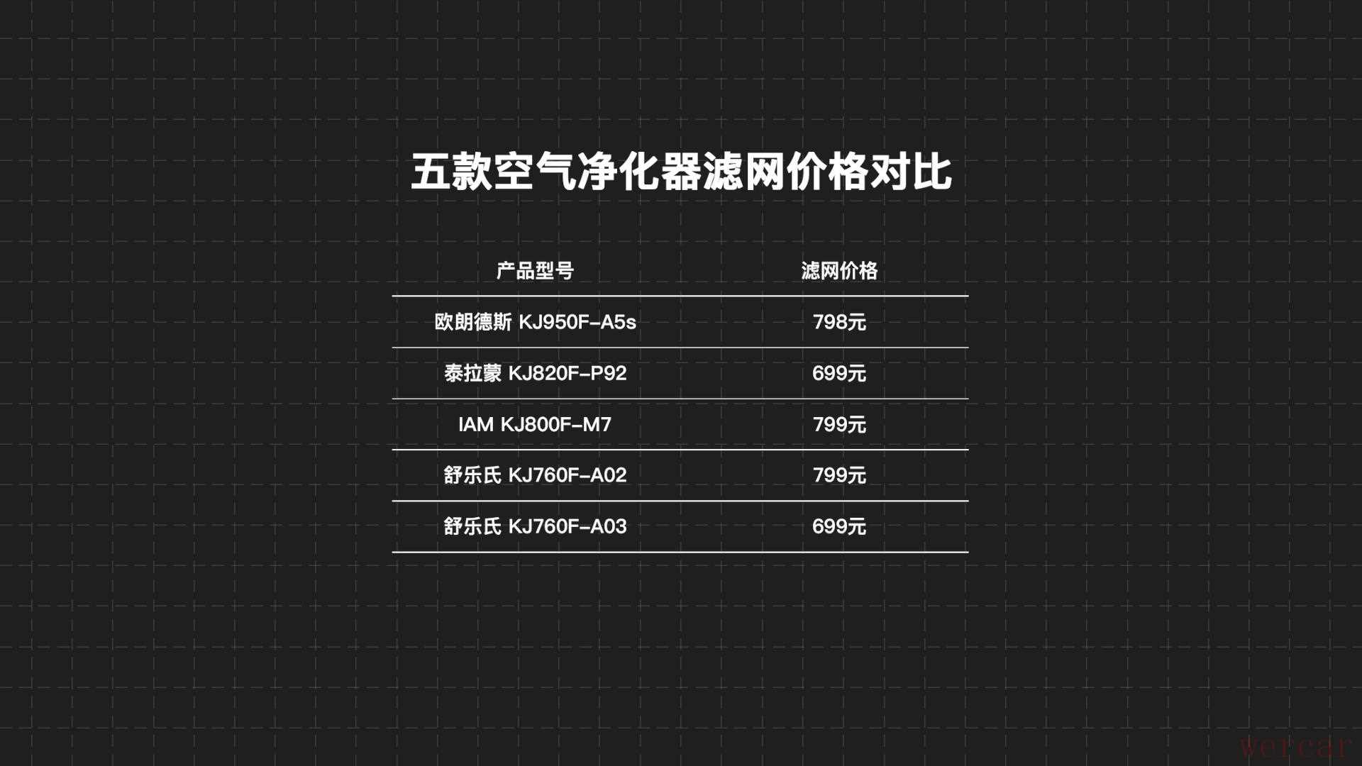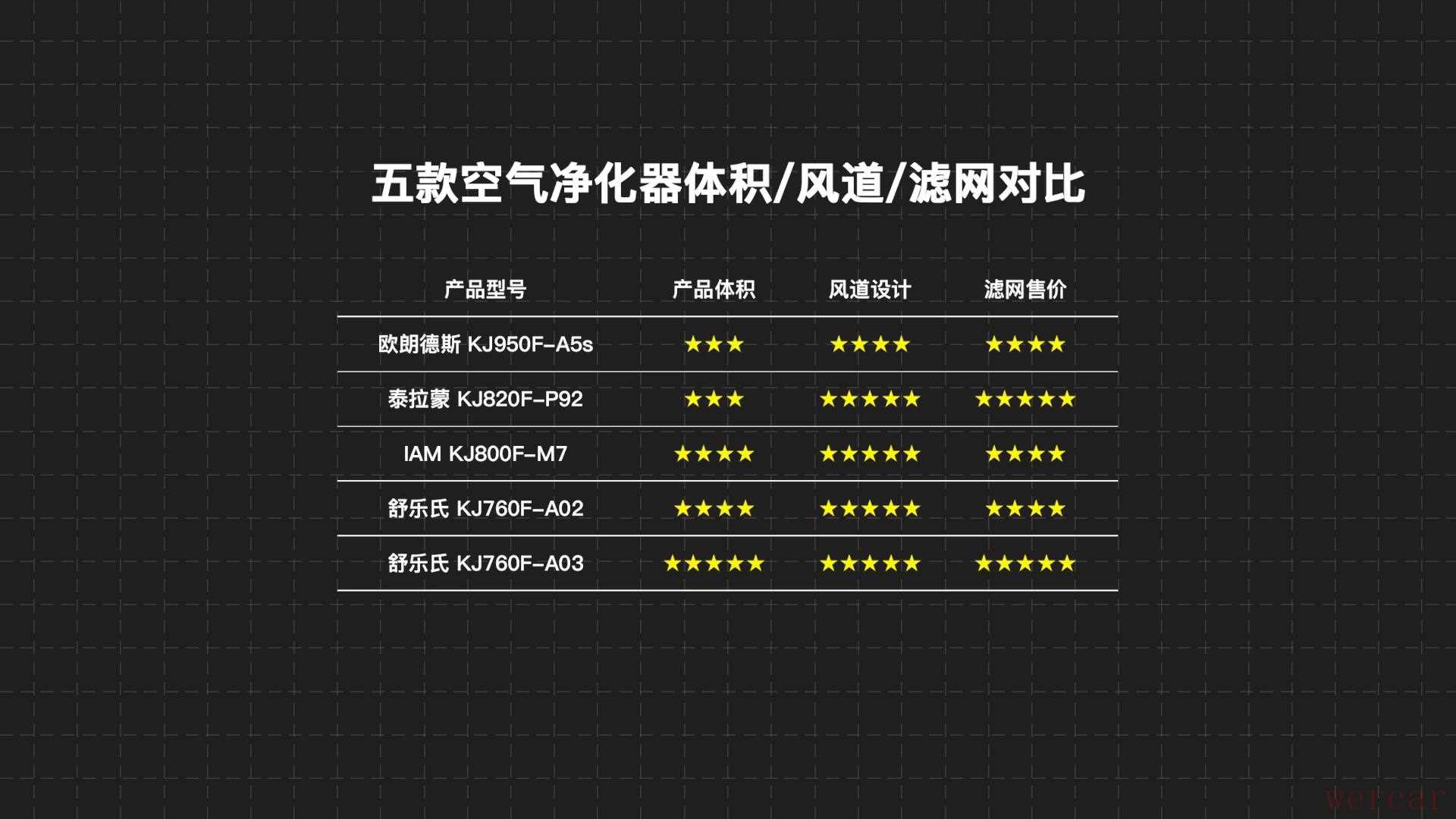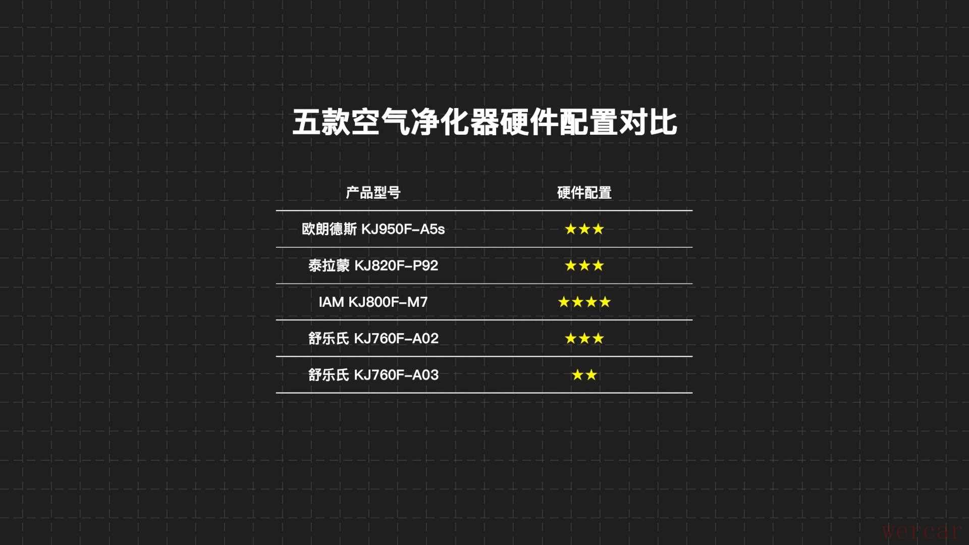 对于一台空气净化器来说,最重要的硬件参数自然是风机和滤网,也就是CADR值和CCM值。这里我们将五款产品的CADR和CCM数值整理为了表格,有需要的朋友可以保存一下。