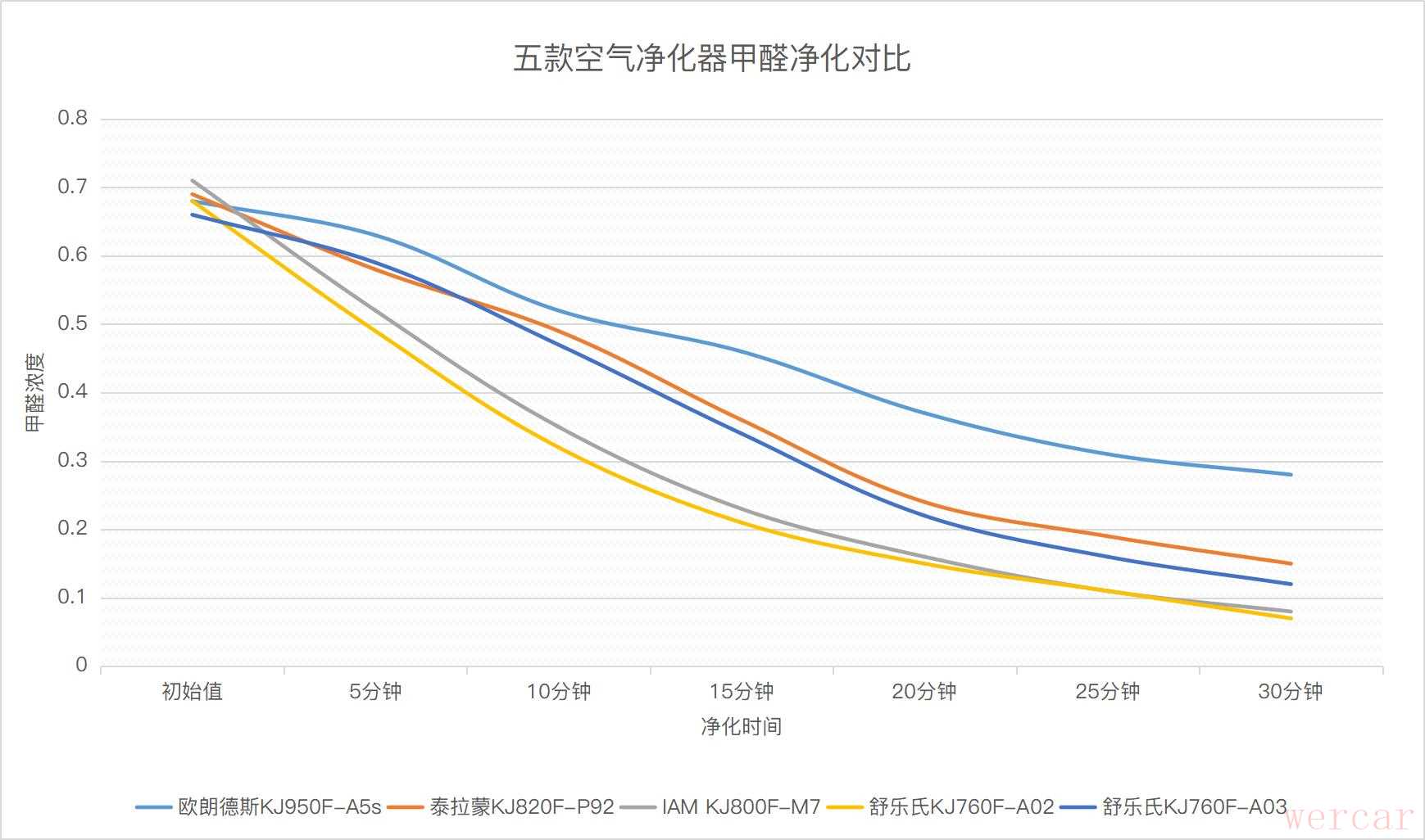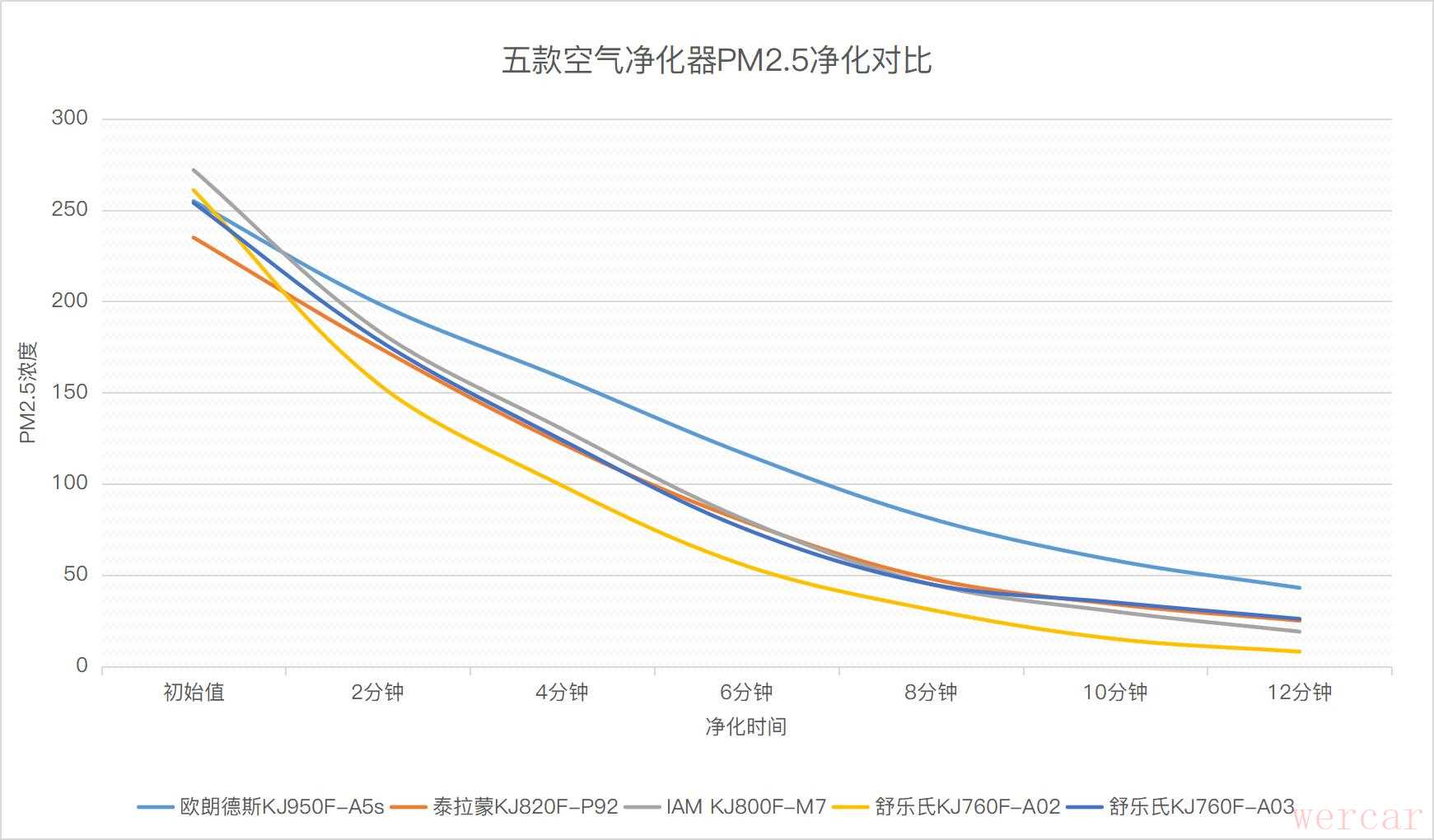 PM2.5浓度下降最快的是舒乐氏的A02,12分钟降低到个位数。其次是IAM、舒乐氏A03、泰拉蒙,三者的曲线交织在一起,实力比较相近。略逊的则是欧朗德斯,PM2.5下降的幅度最小,速度也是最慢。